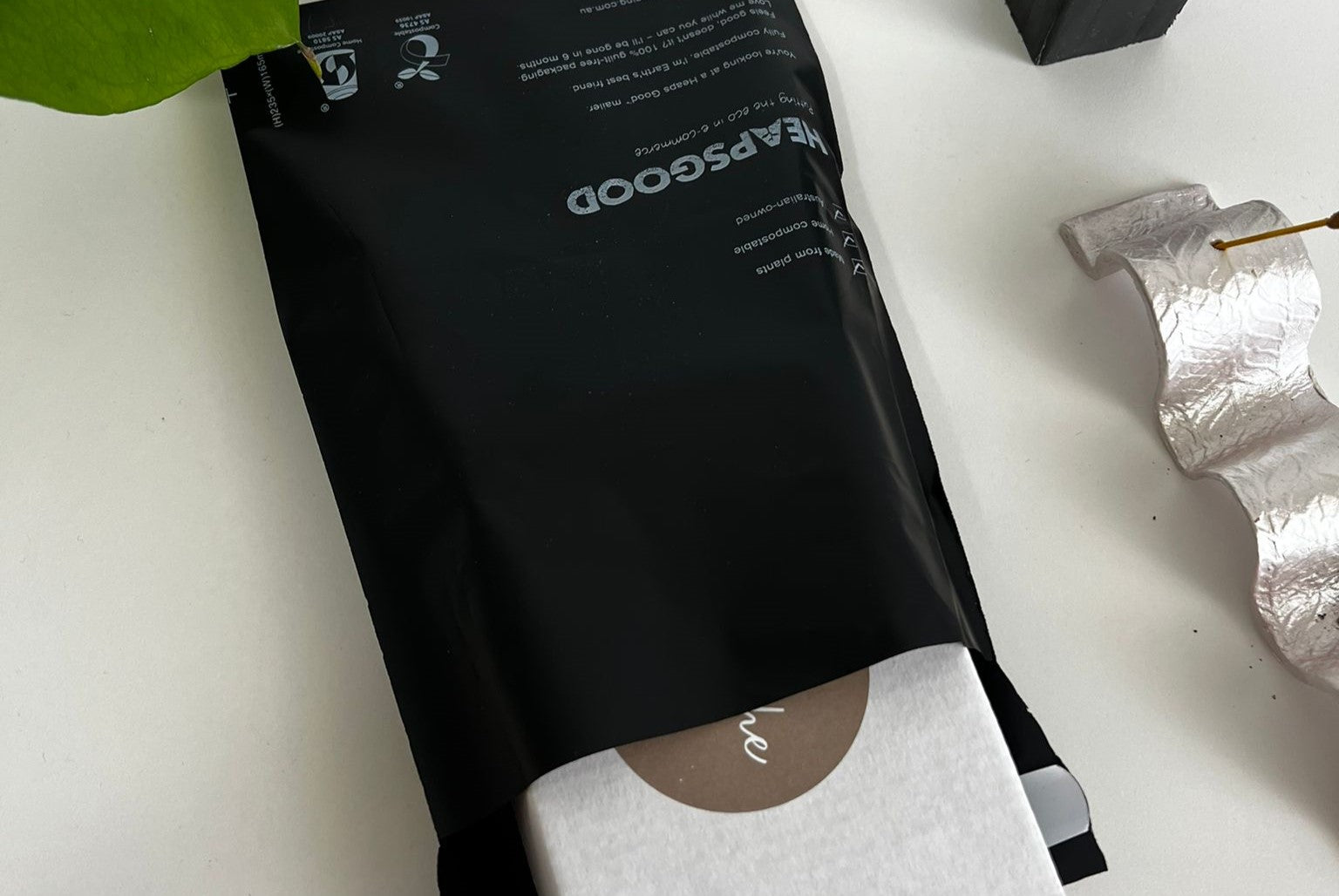 And finally, put it into an eco-mailer so the box makes it to you in pristine condition. The mailer bag is compostable and will be gone in six months. And then we run to the post office! See you soon!