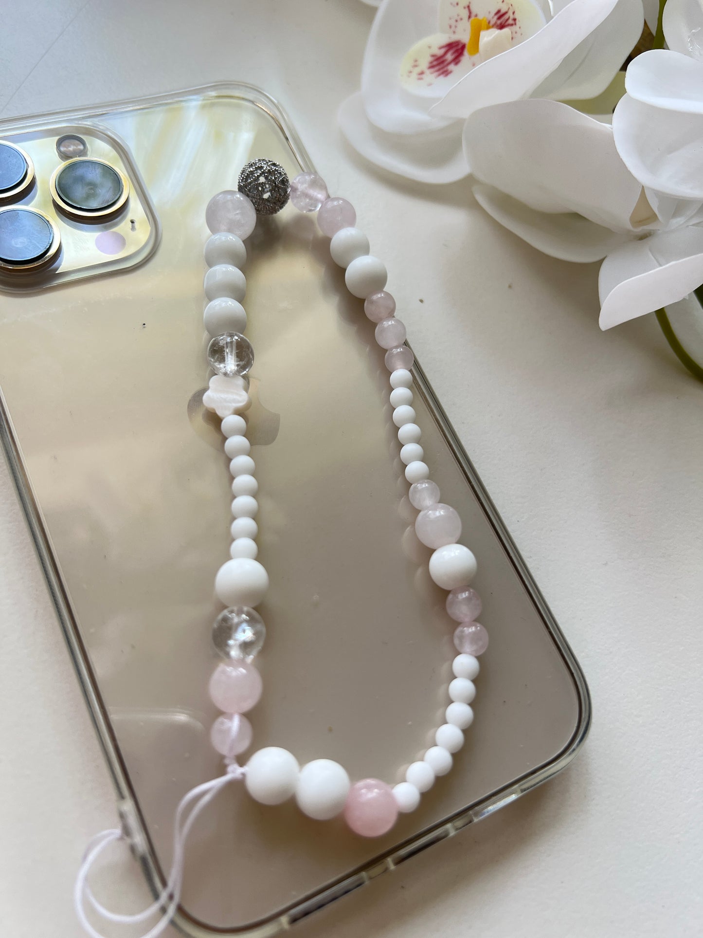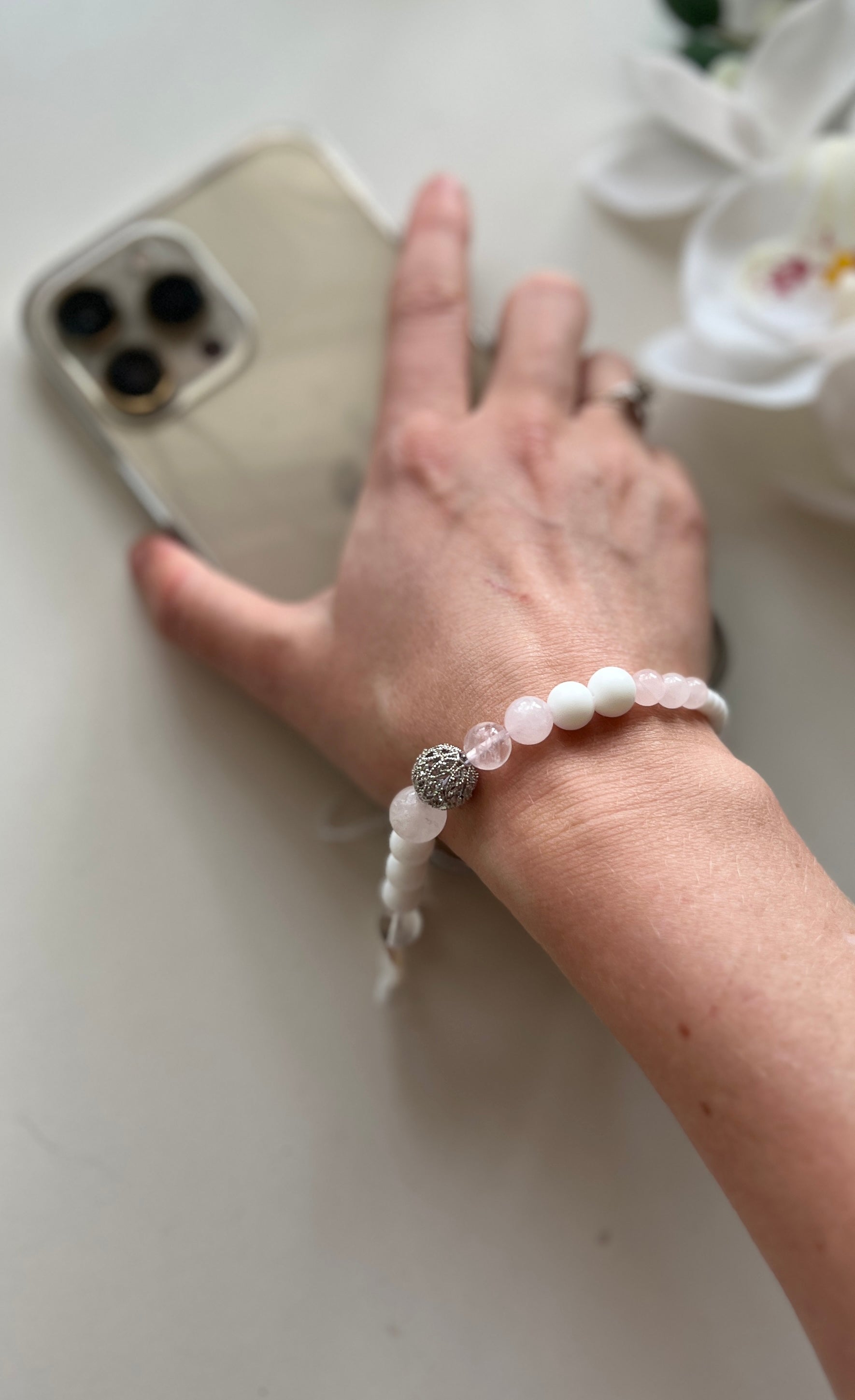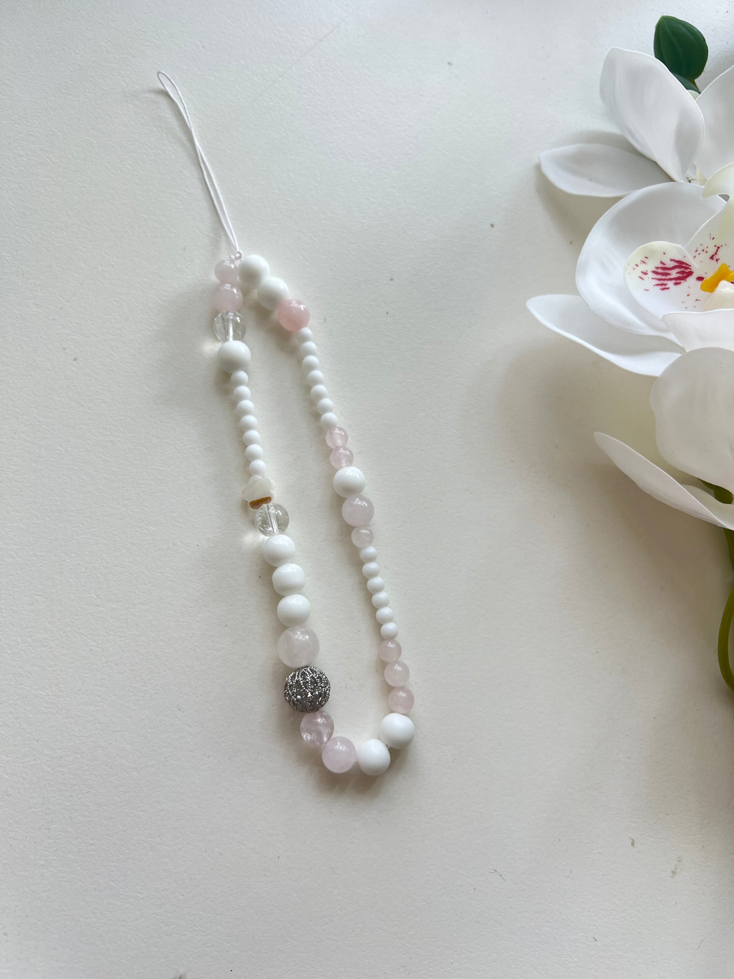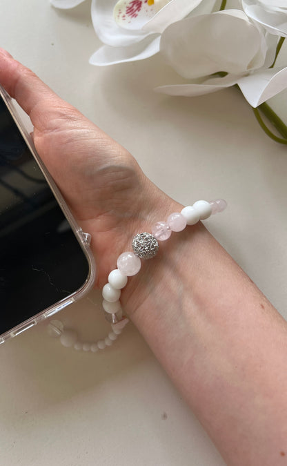 Enhance your style with our Love Phone Bracelet, featuring Rose Quartz, White Agate, Shell, and Clear Quartz.
