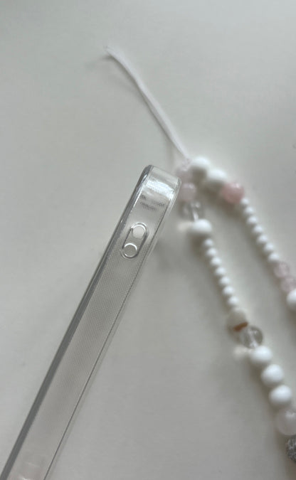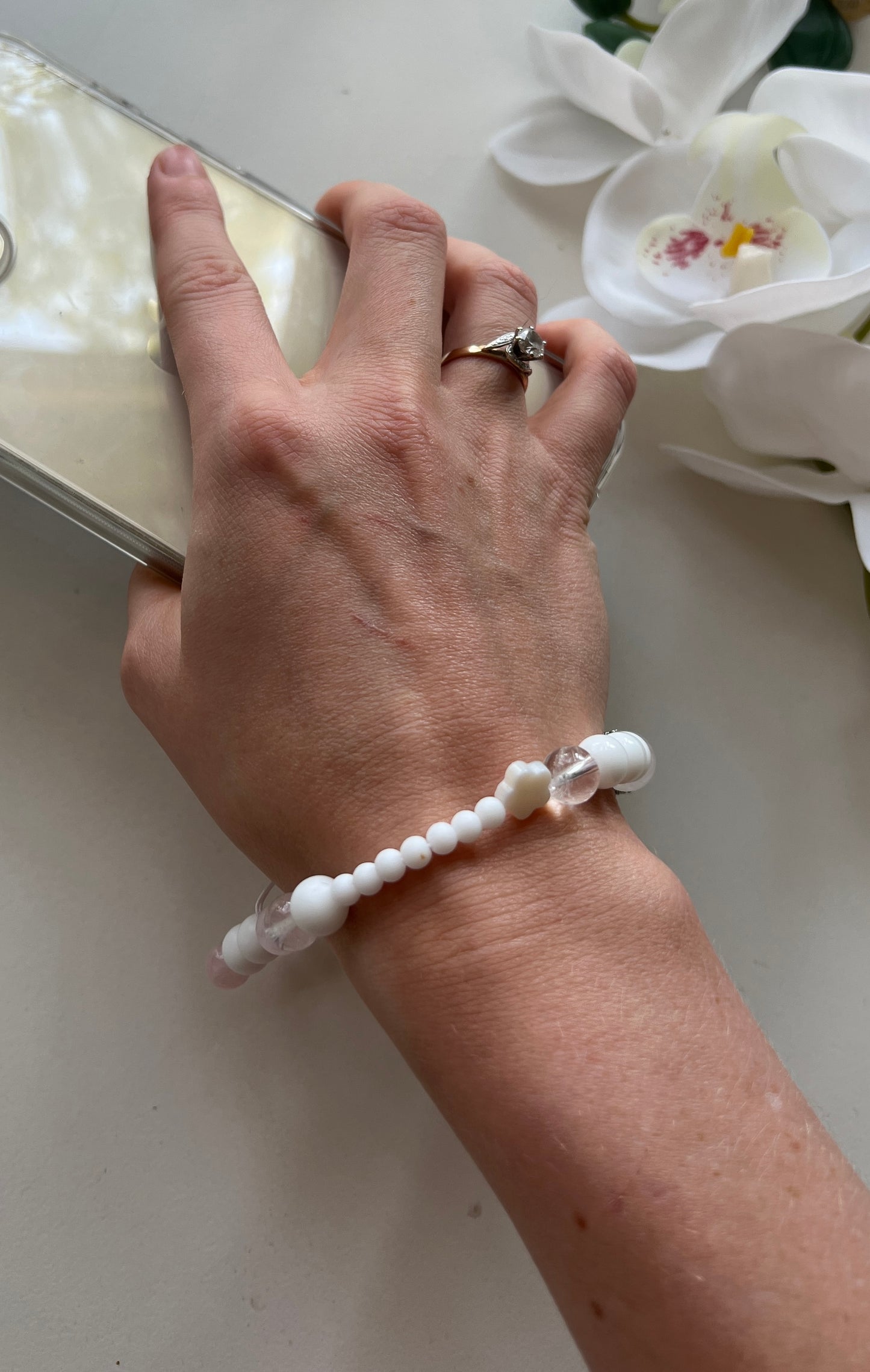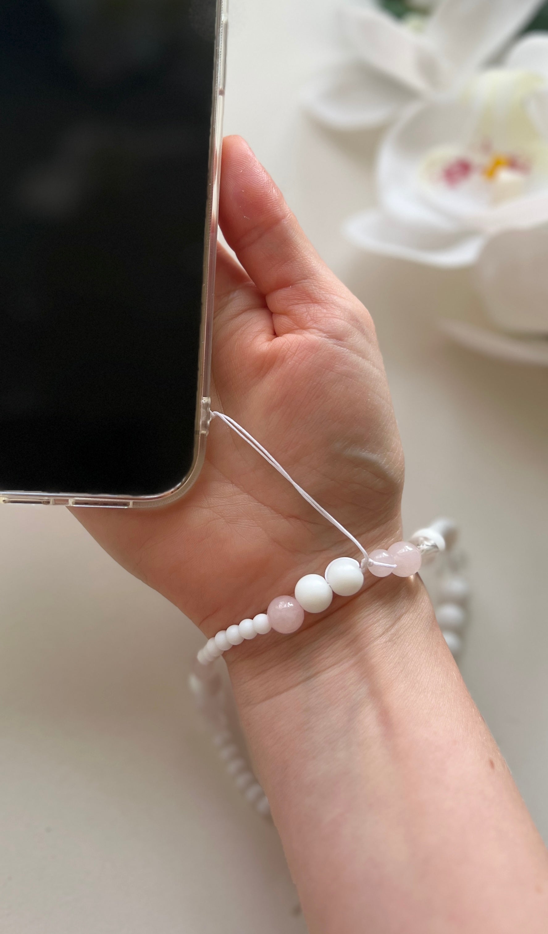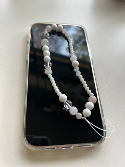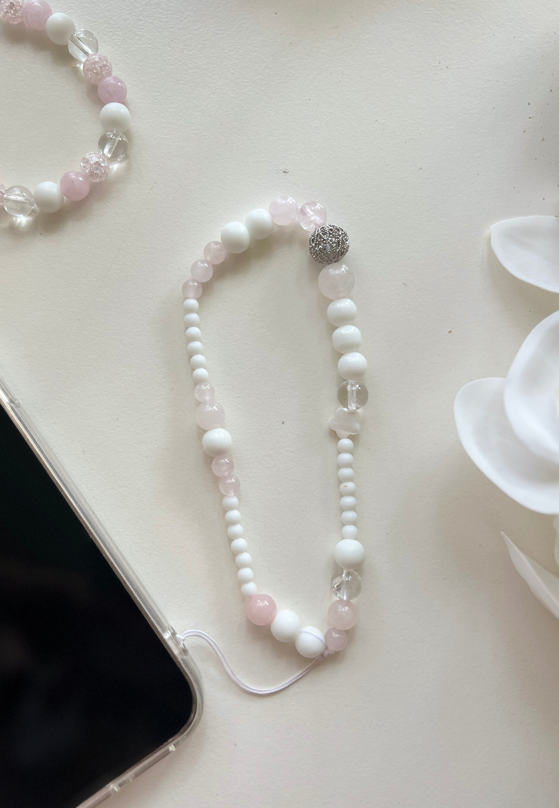 Enhance your style with our Love Phone Bracelet, featuring Rose Quartz, White Agate, Shell, and Clear Quartz.