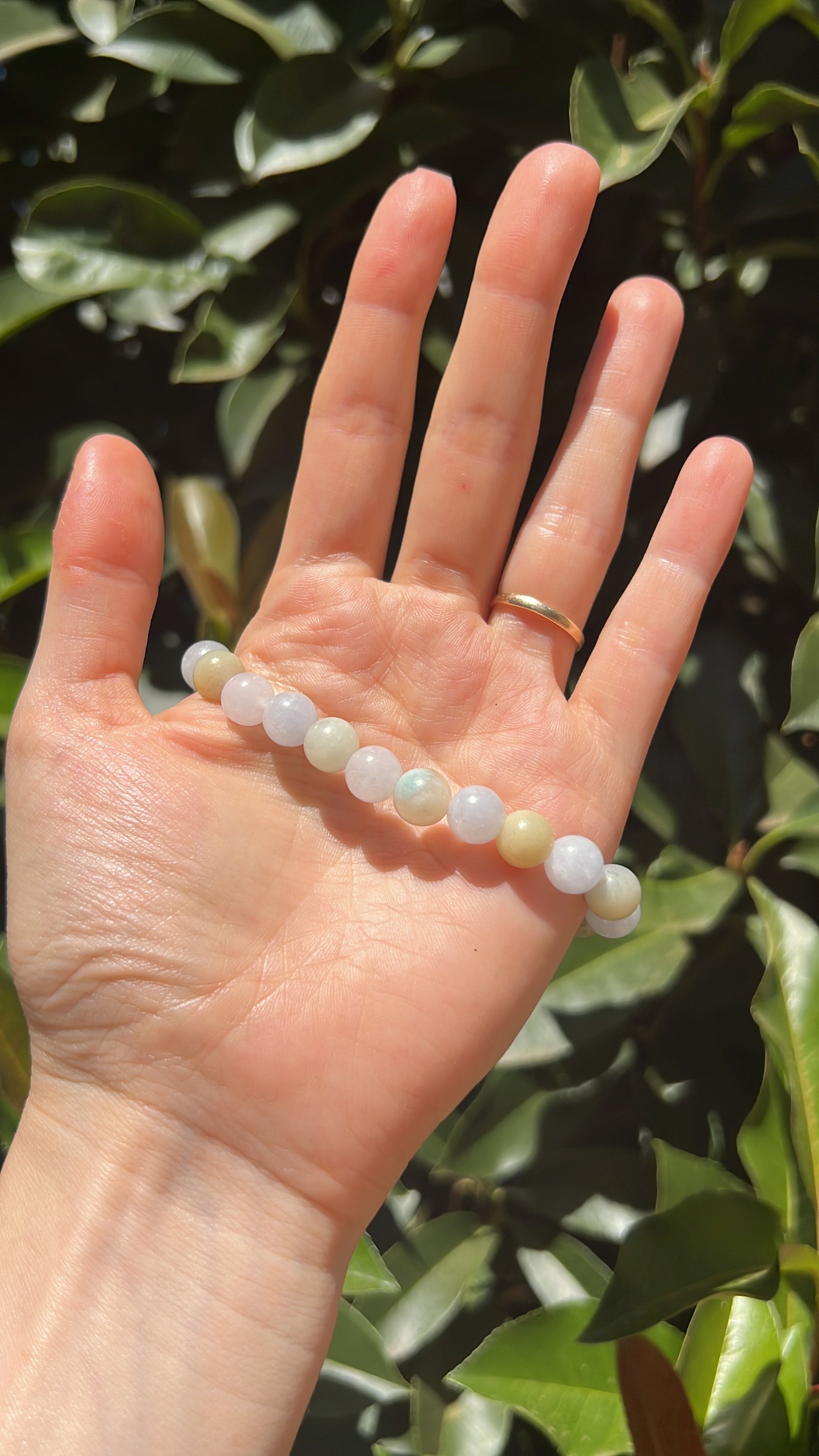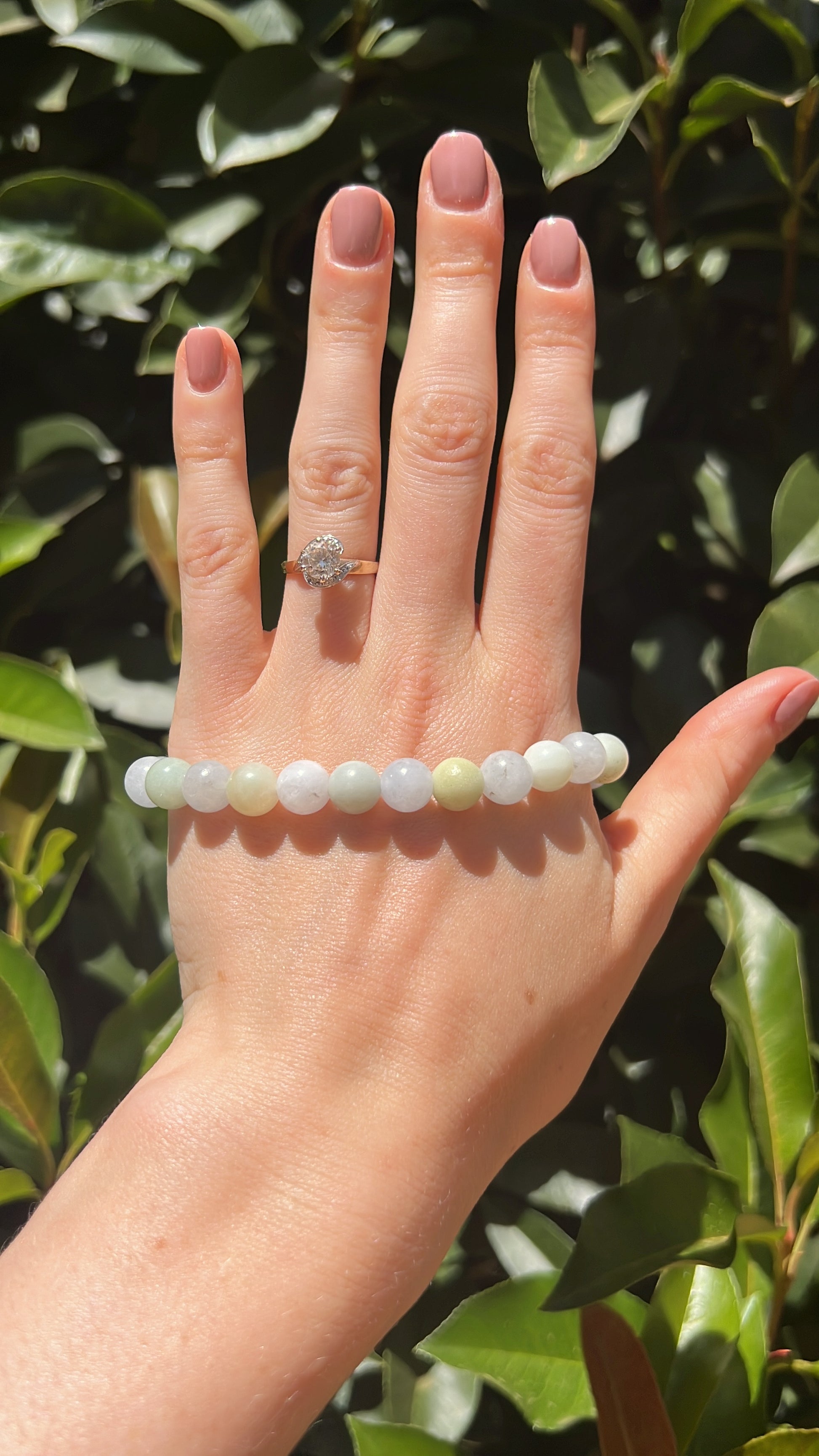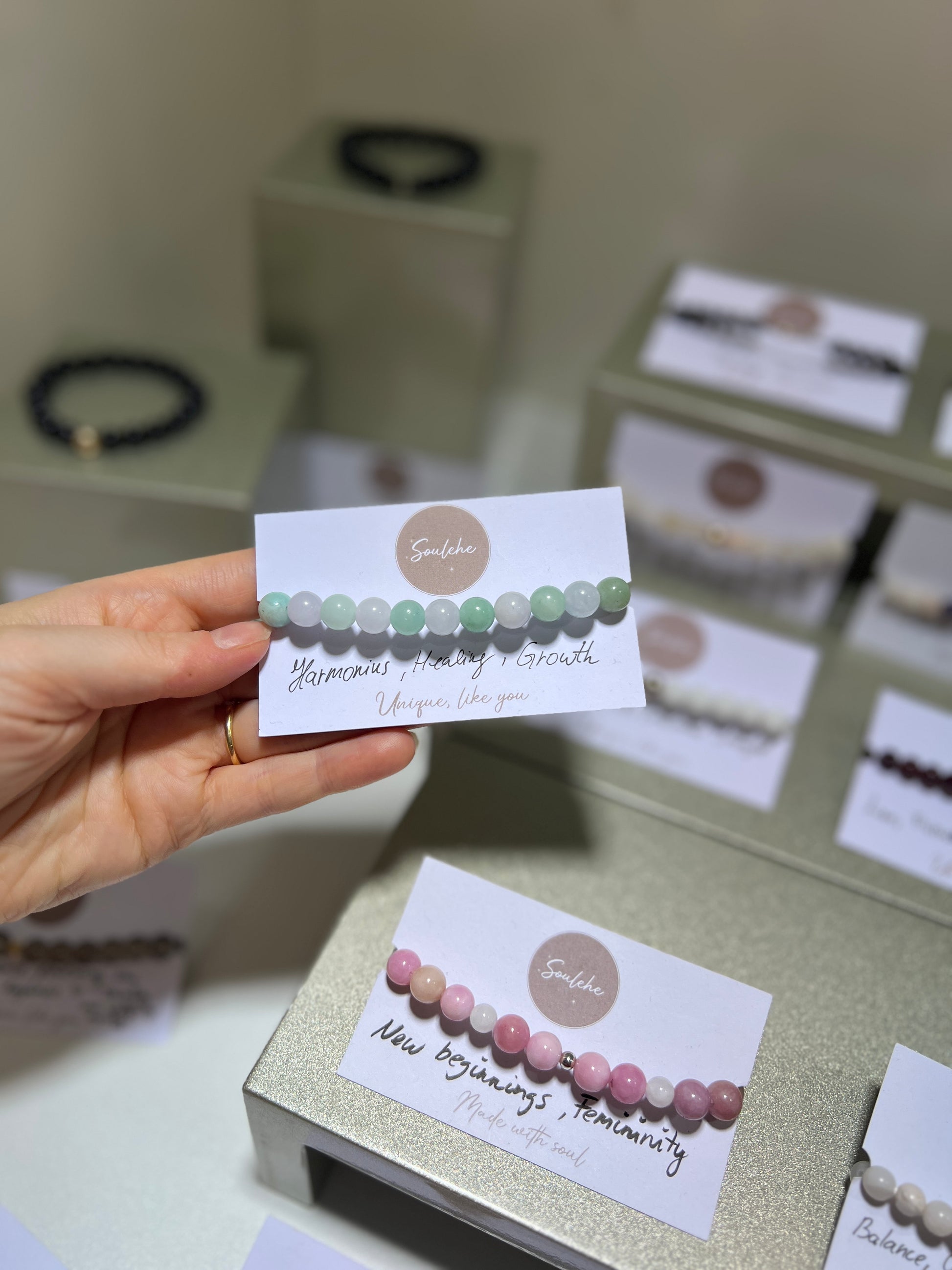 A lot of the crystals and gemstones that we use are porous, which means that their colour and brightness can change over time due to humidity, perfumes, and cosmetics.