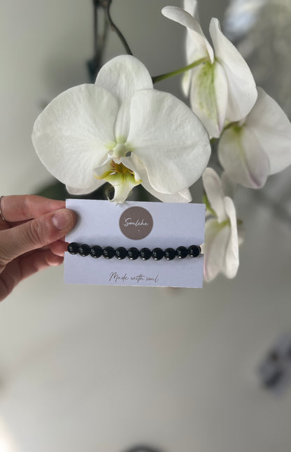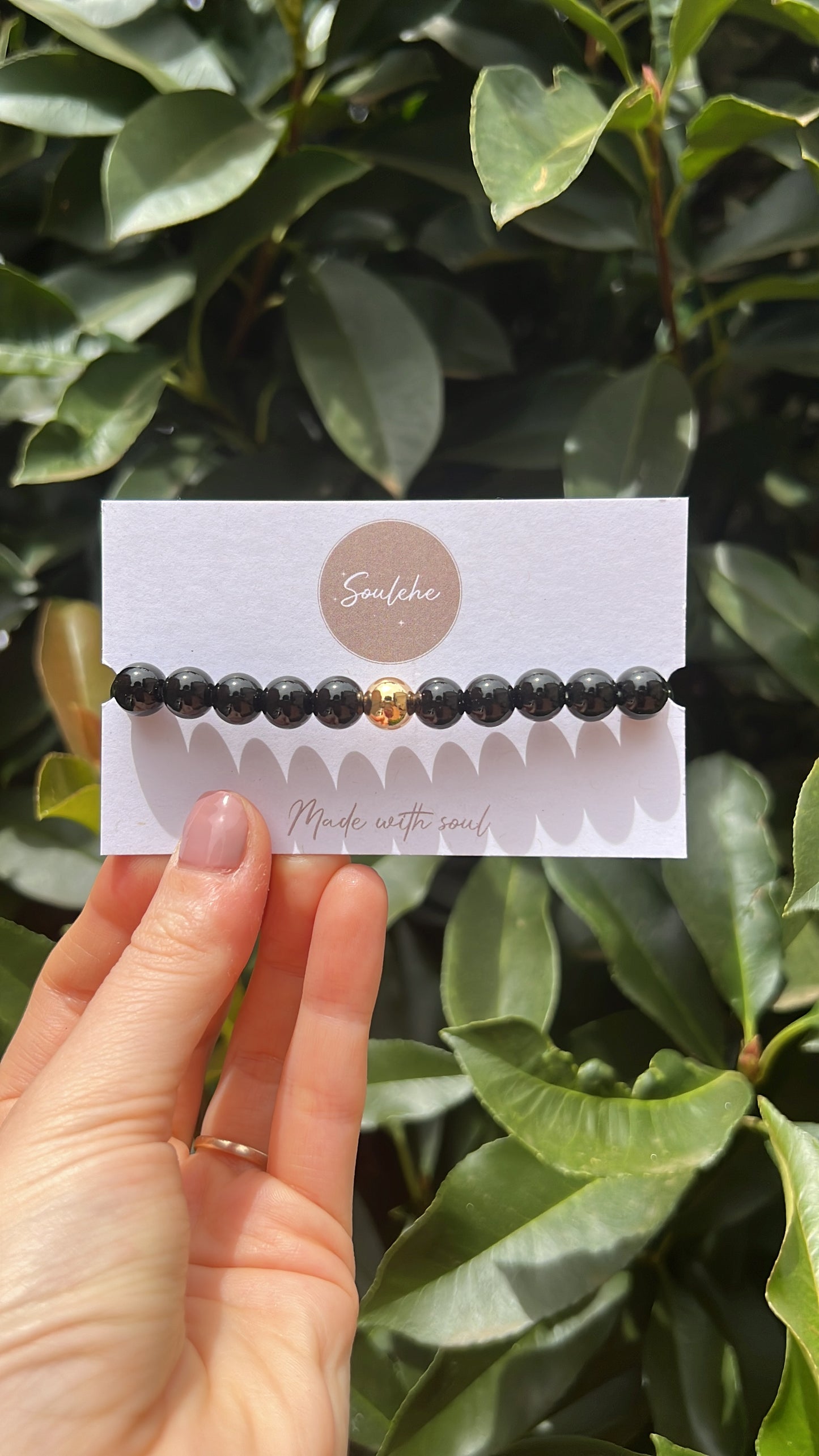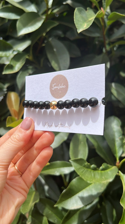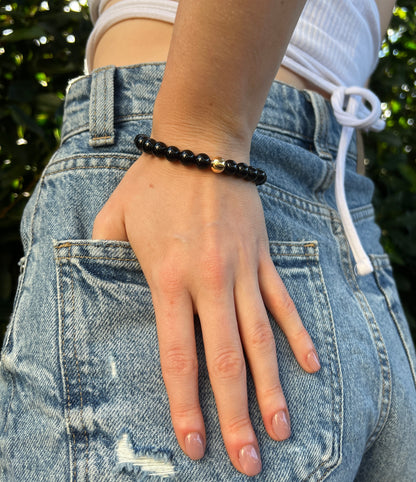 Silver Obsidian enhances spiritual communication and promotes truth and growth, healing the soul and reviving your life force. The gold bead adds a touch of luxury while emphasizing the bracelet's protective qualities. Perfect for those seeking a harmonious balance between elegance and spiritual cleansing.