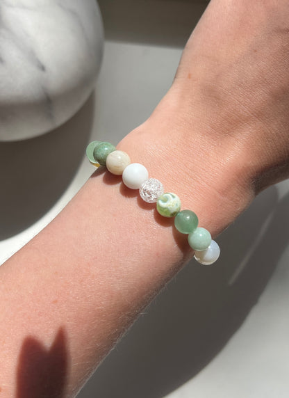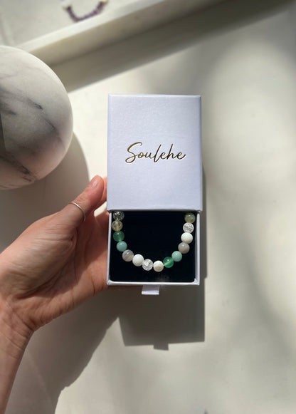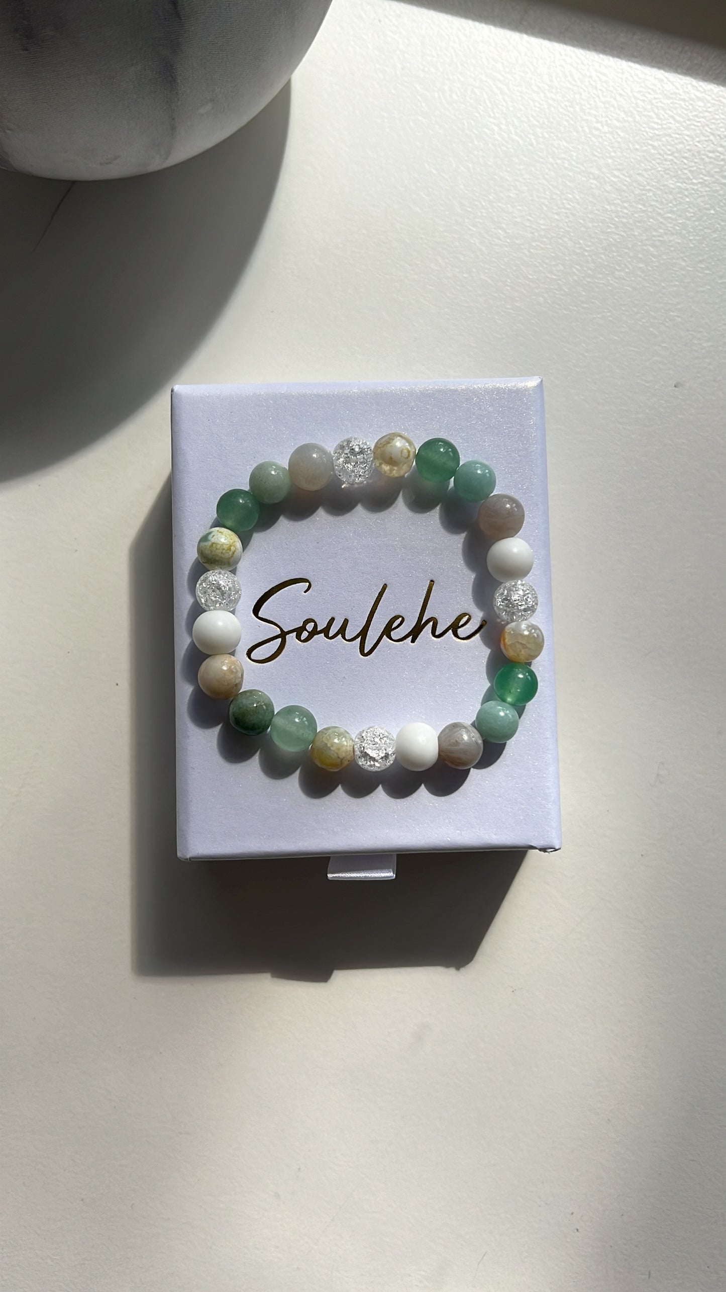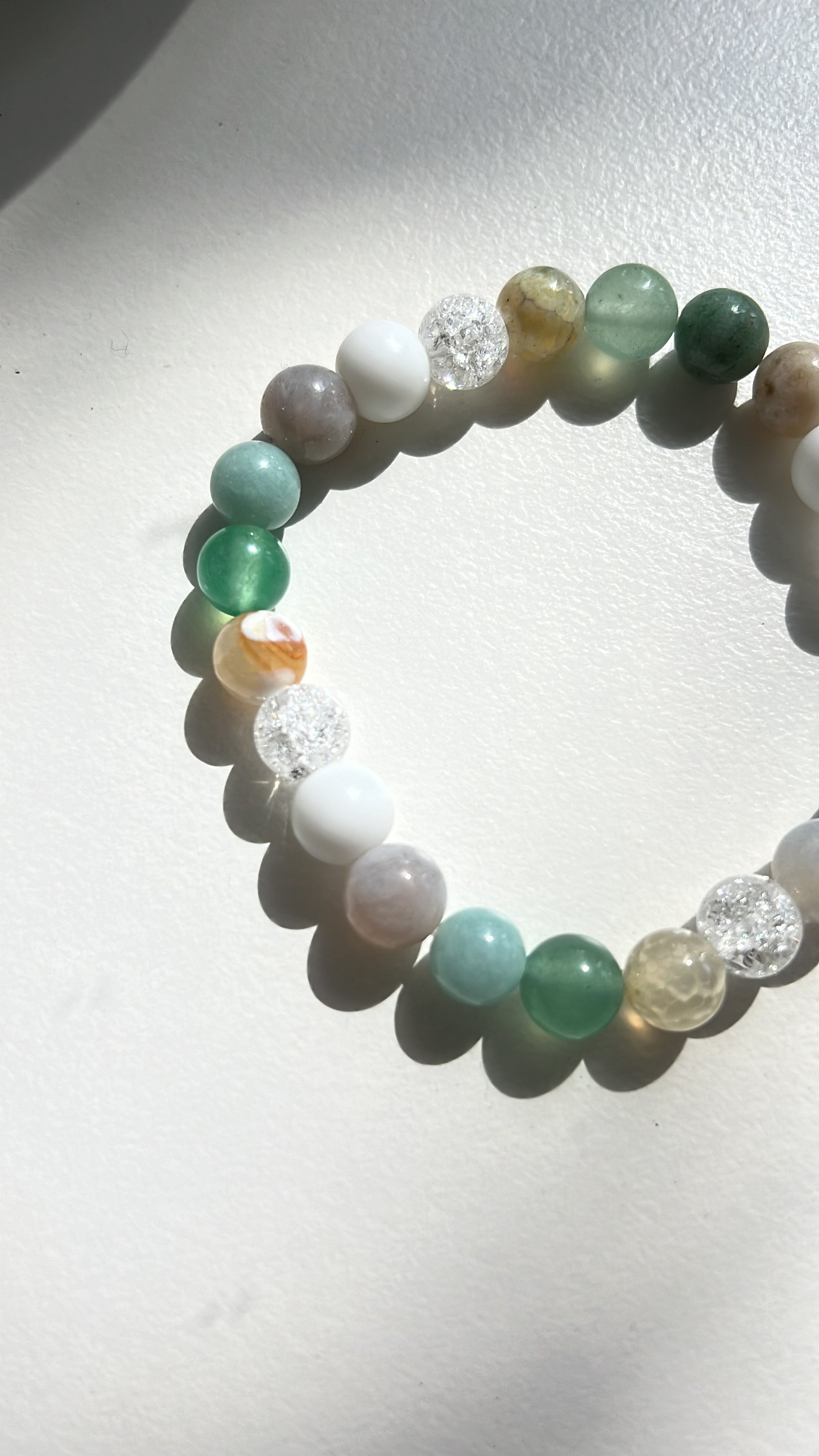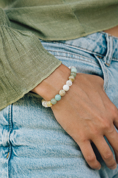 Embrace abundance with our Prosperity Bracelet, featuring Green Aventurine, White Agate, Bamboo Agate, and Amazonite.