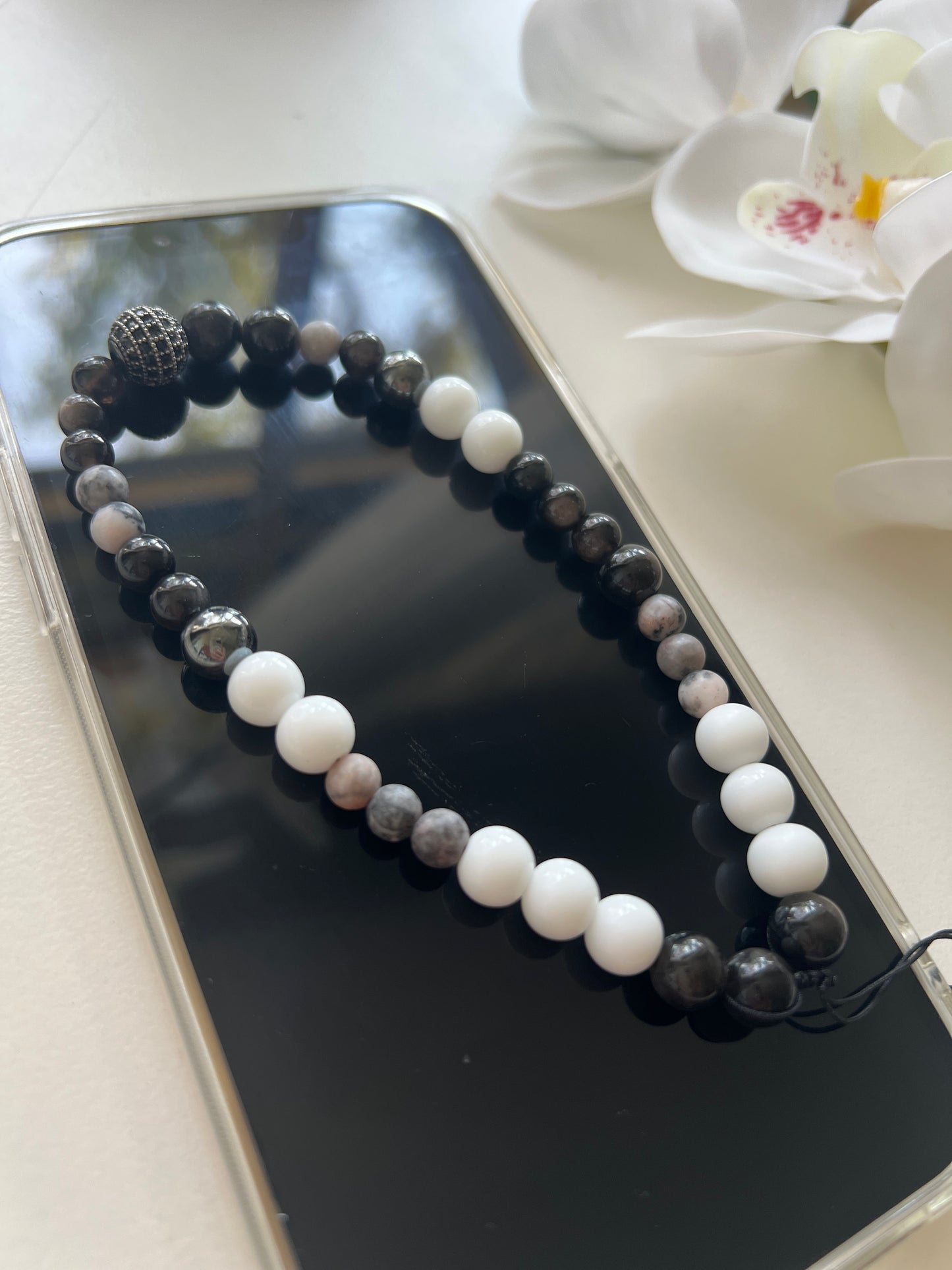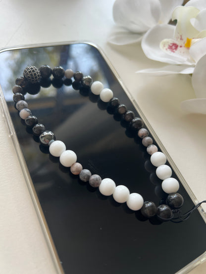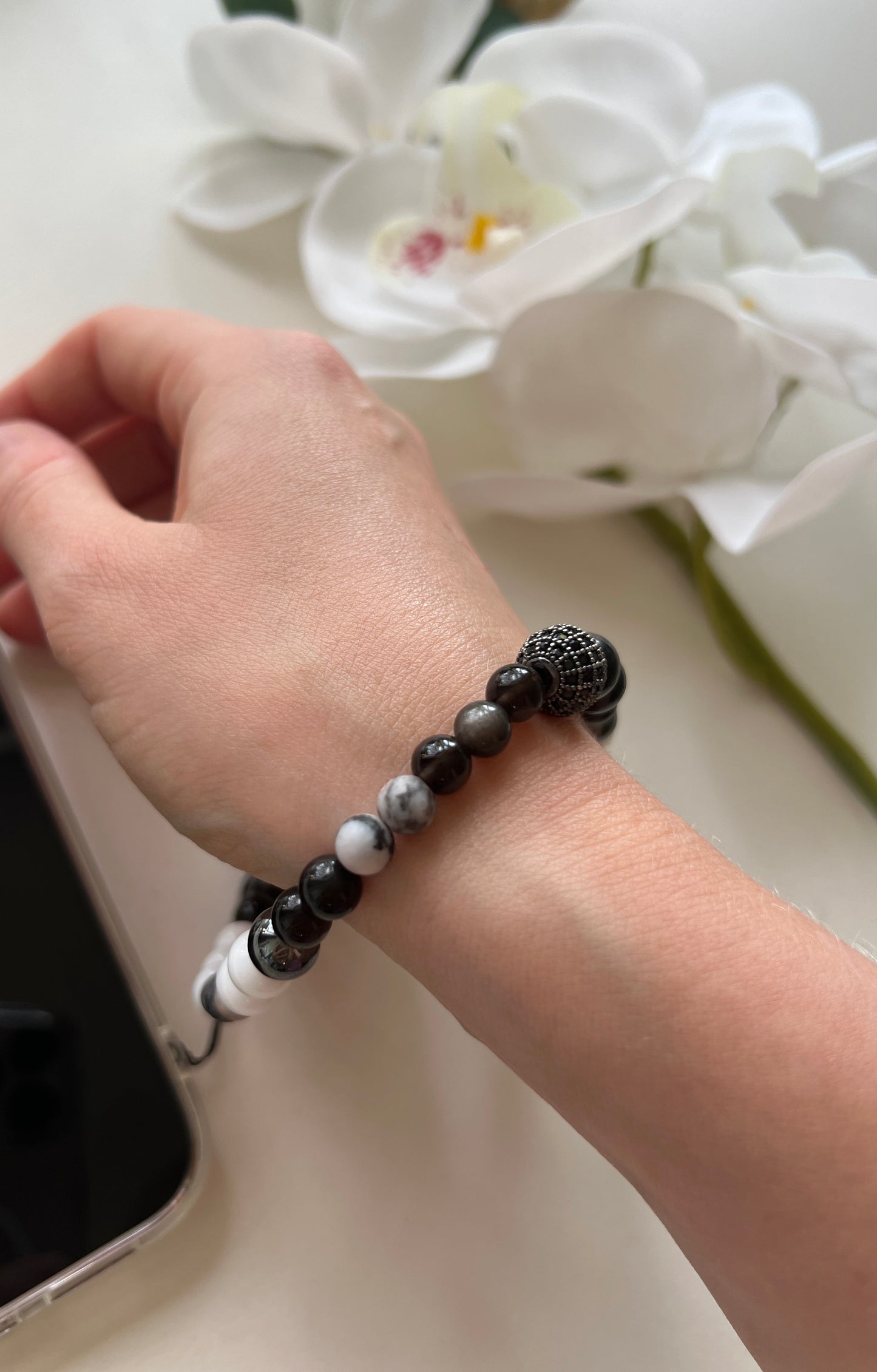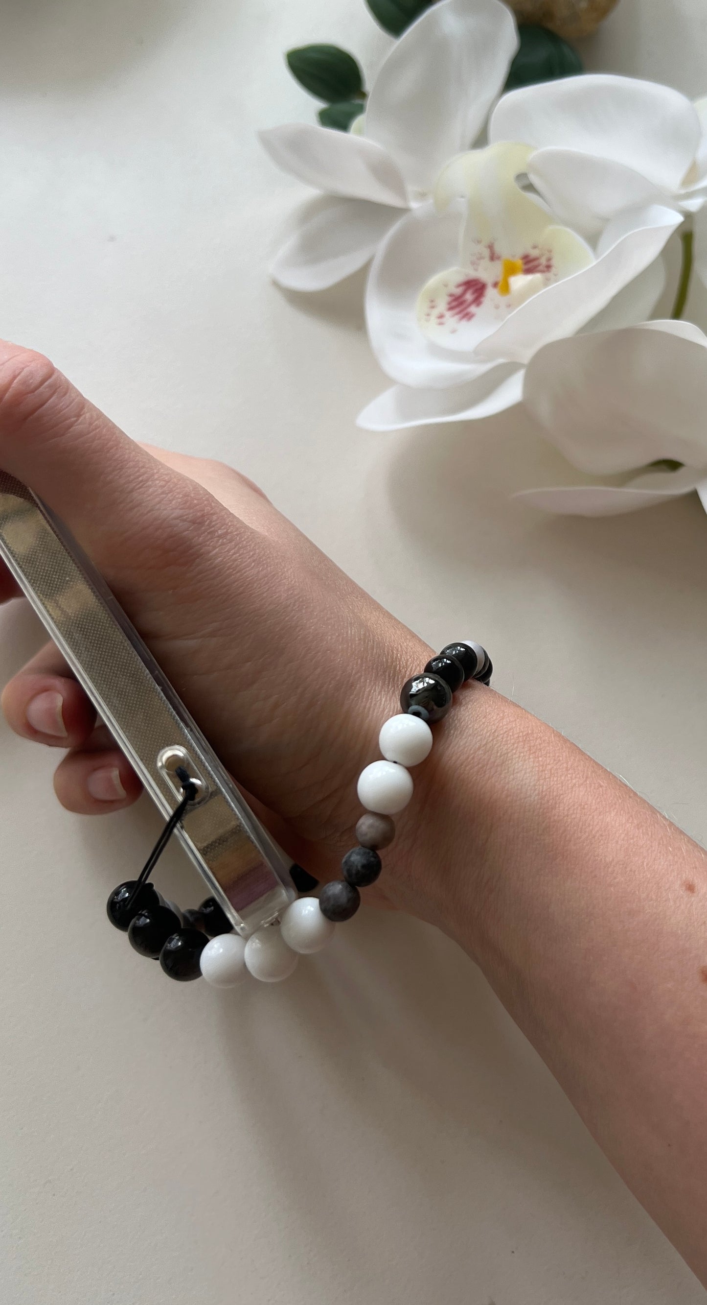 Combine style and comfort with our Protection Phone Bracelet, featuring Obsidian, Pink Zebra, and White Agate stones.