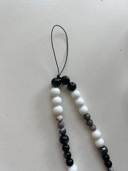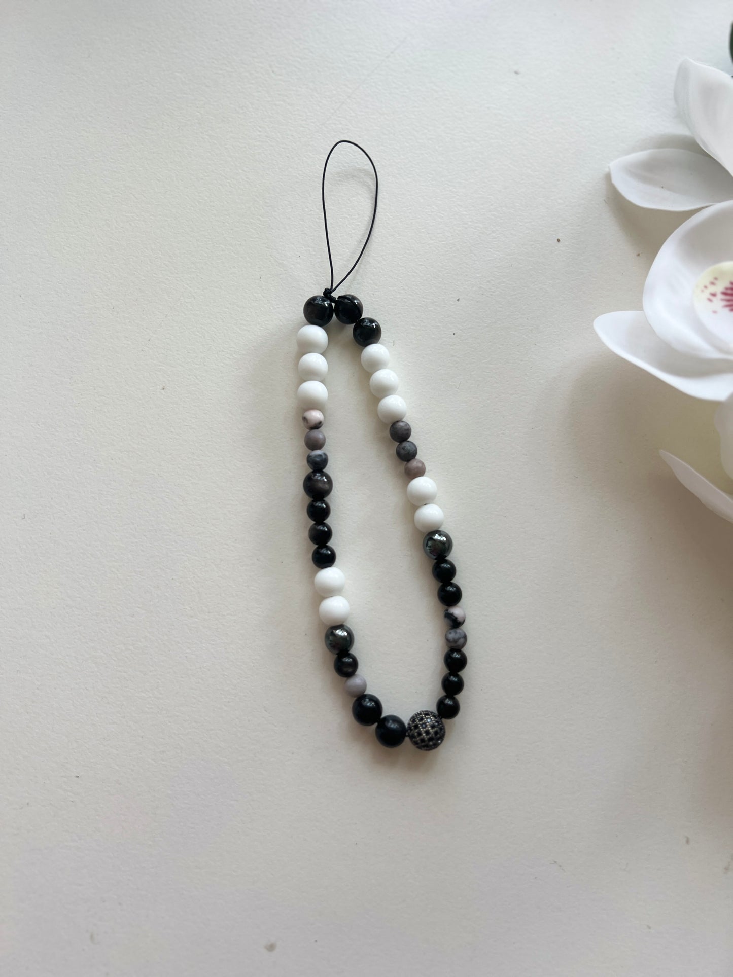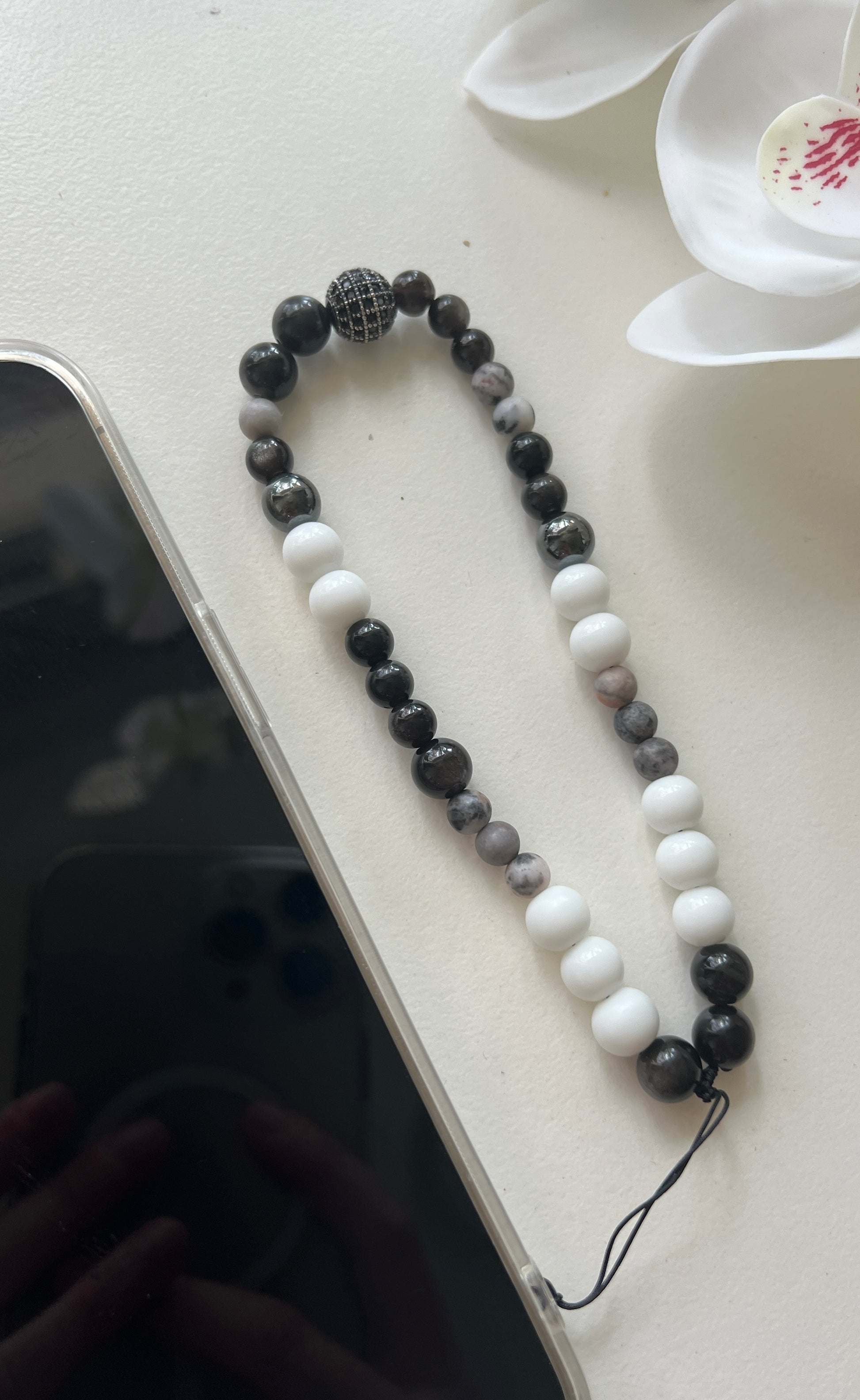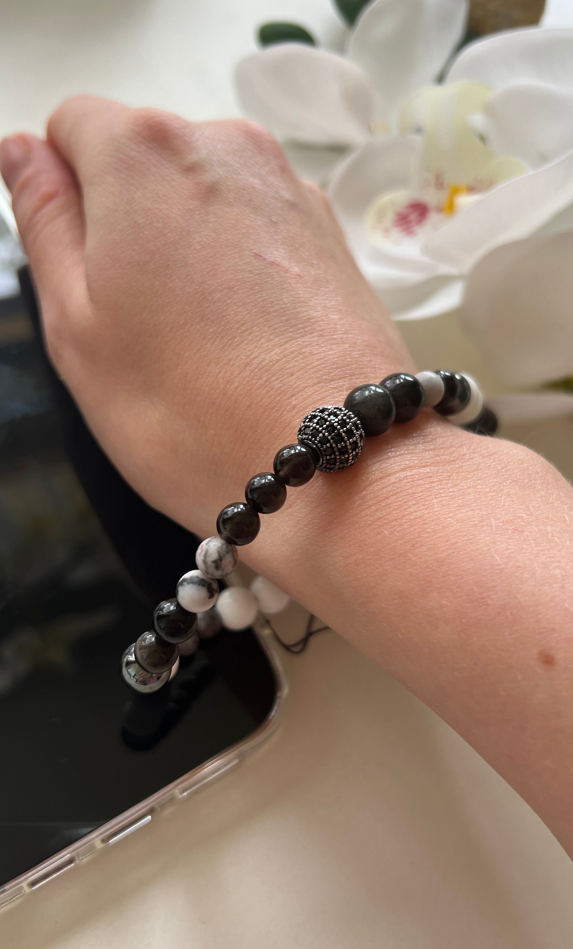 Combine style and comfort with our Protection Phone Bracelet, featuring Obsidian, Pink Zebra, and White Agate stones.