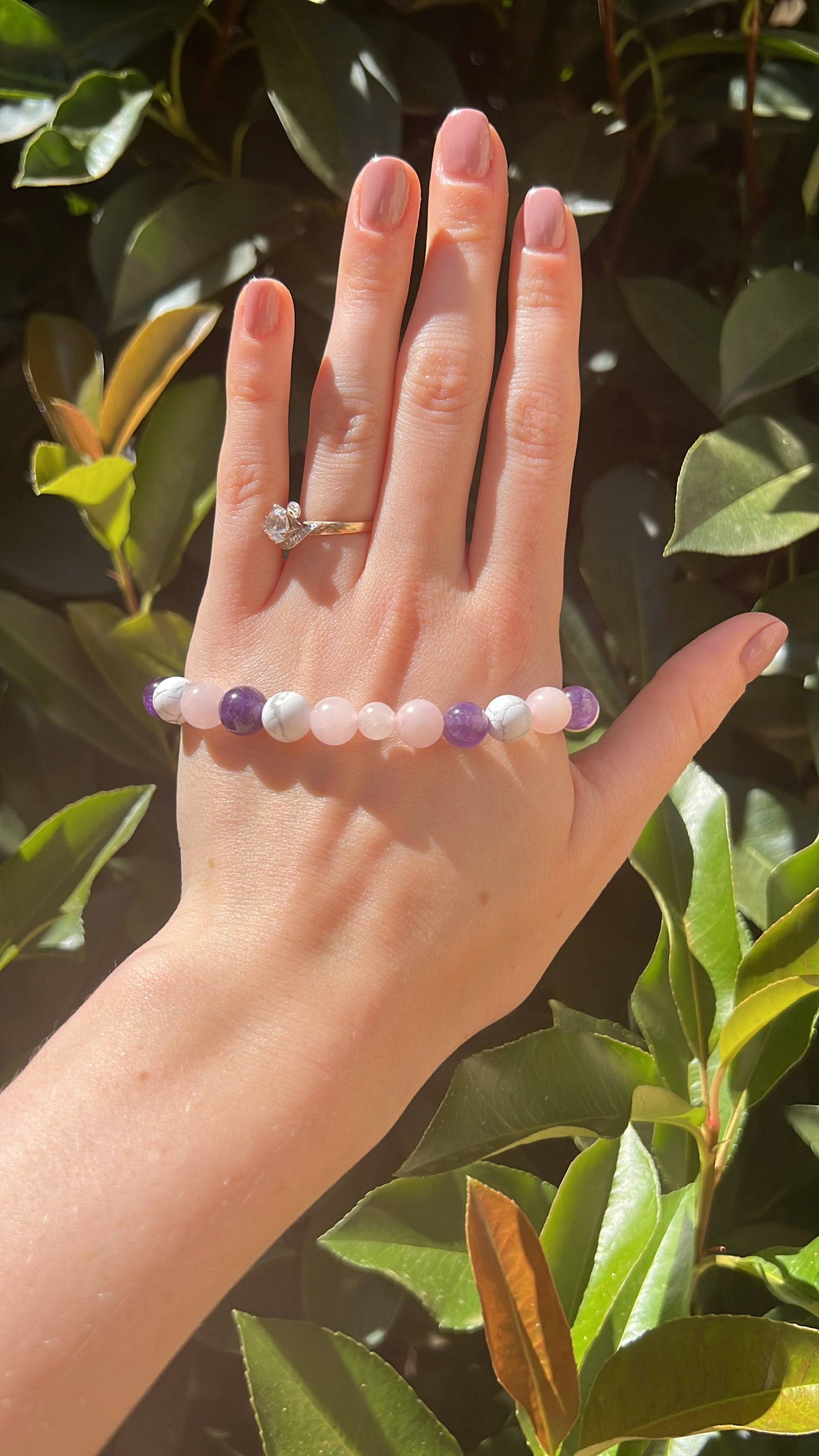 Embark on your journeys with the Travel Bracelet, a perfect fusion of Rose Quartz, Aquamarine, Amethyst, and Howlite.