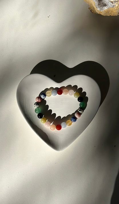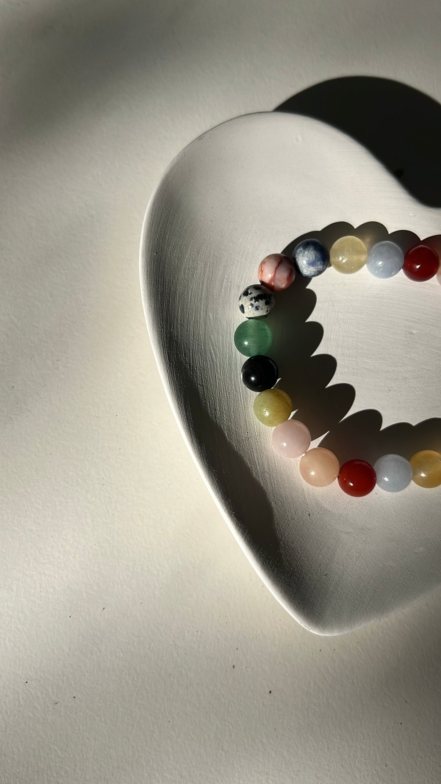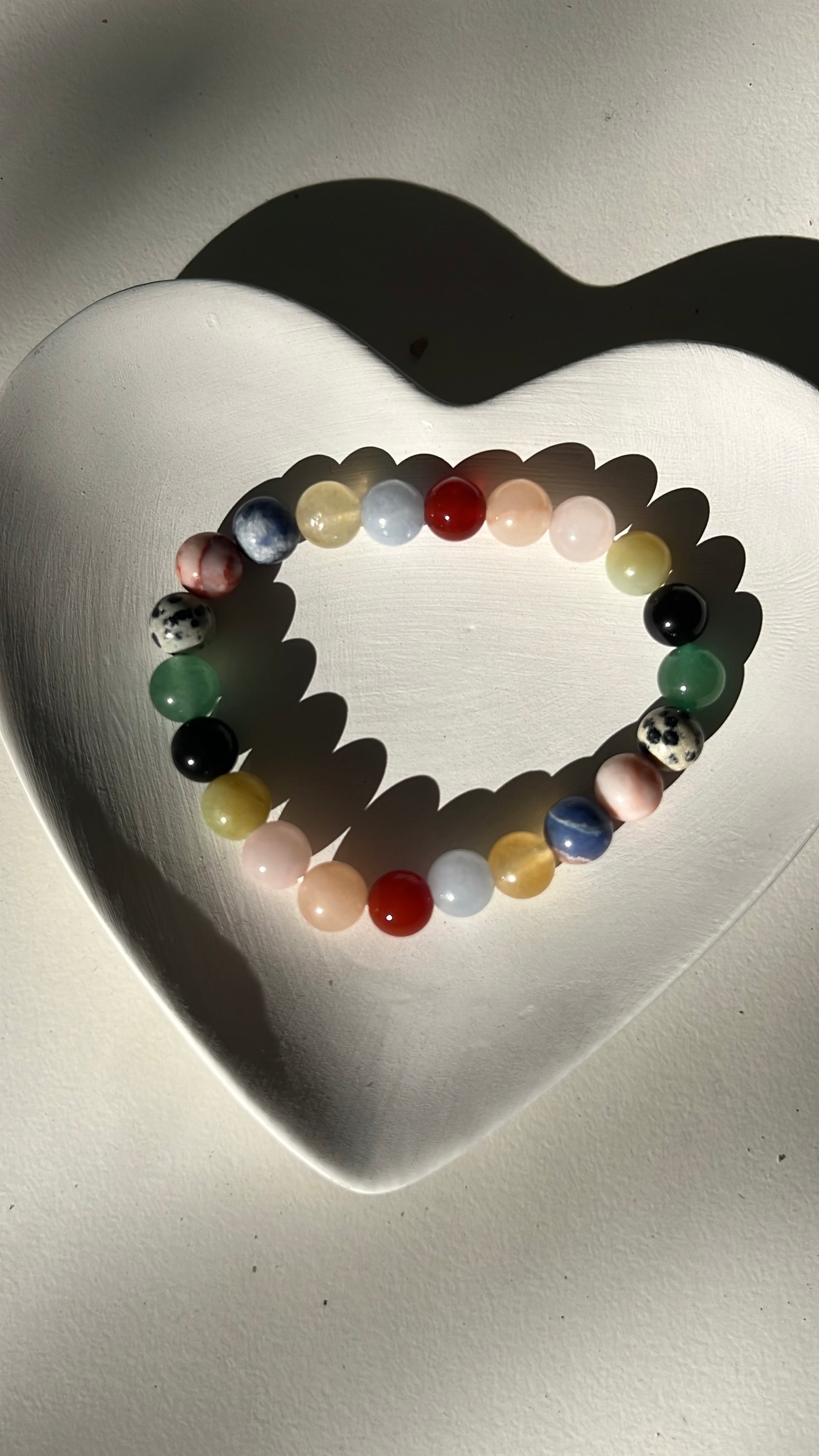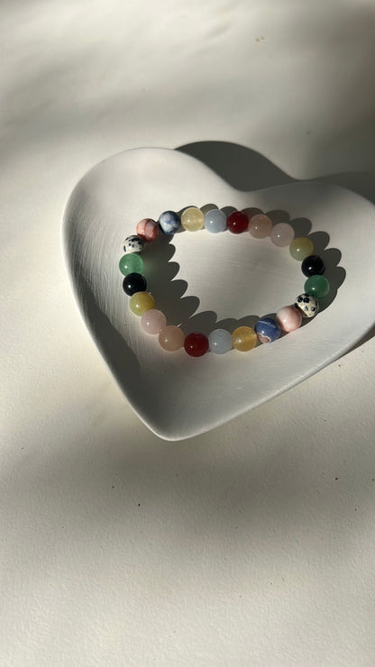 Featuring stones like Green Aventurine for luck and prosperity, Dalmatian Jasper for grounding and playfulness, Pink Zebra for harmony and optimism, and Jade for joy and success. Citrine and Carnelian add vitality, motivation, and abundance, while Pink Aventurine and Rose Quartz bring love, compassion, and emotional healing. Obsidian provides protection and grounding, Blue Sodalite supports wisdom and balance, and Aquamarine enhances courage and clarity in relationships.