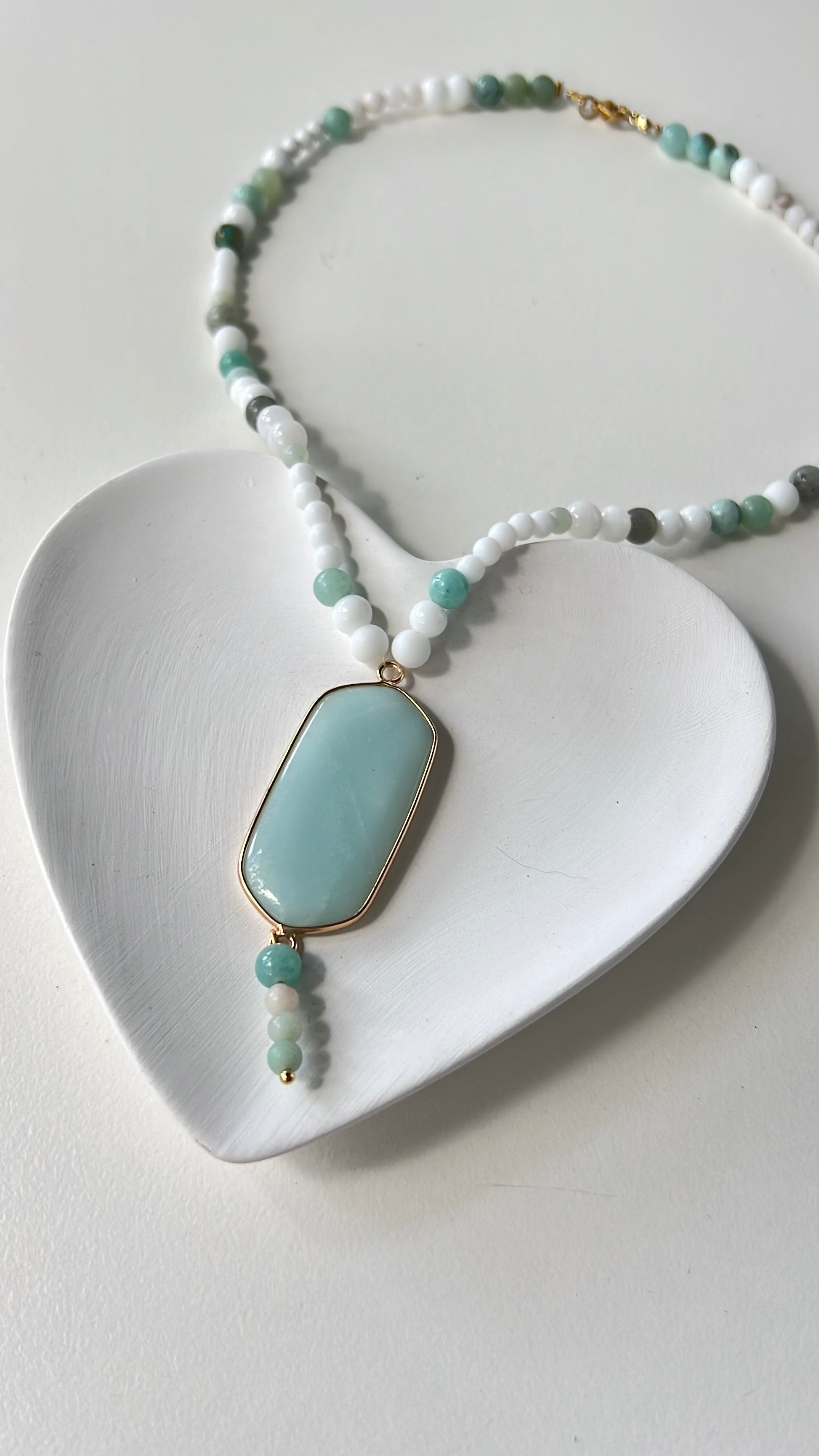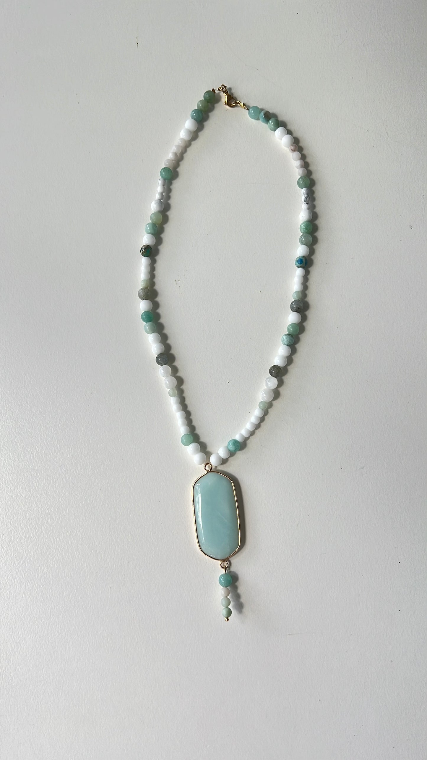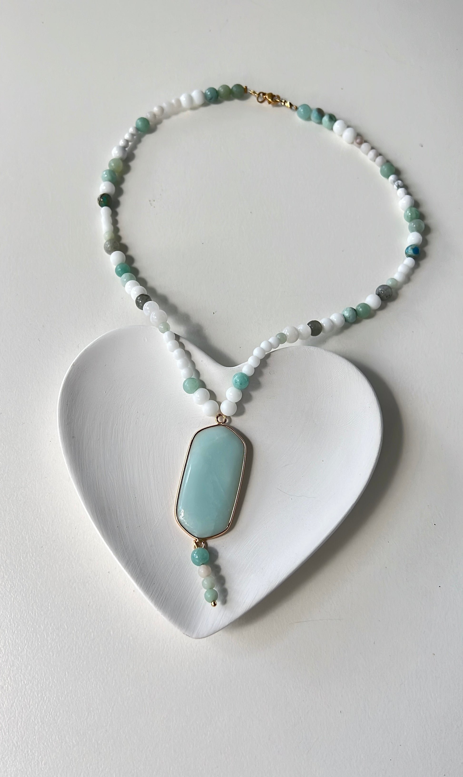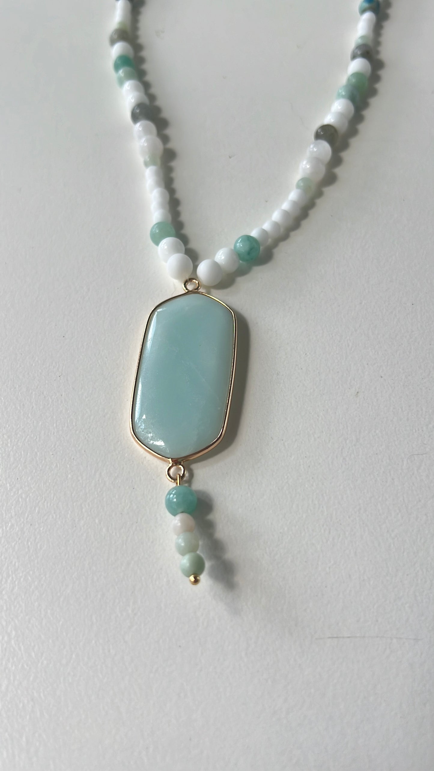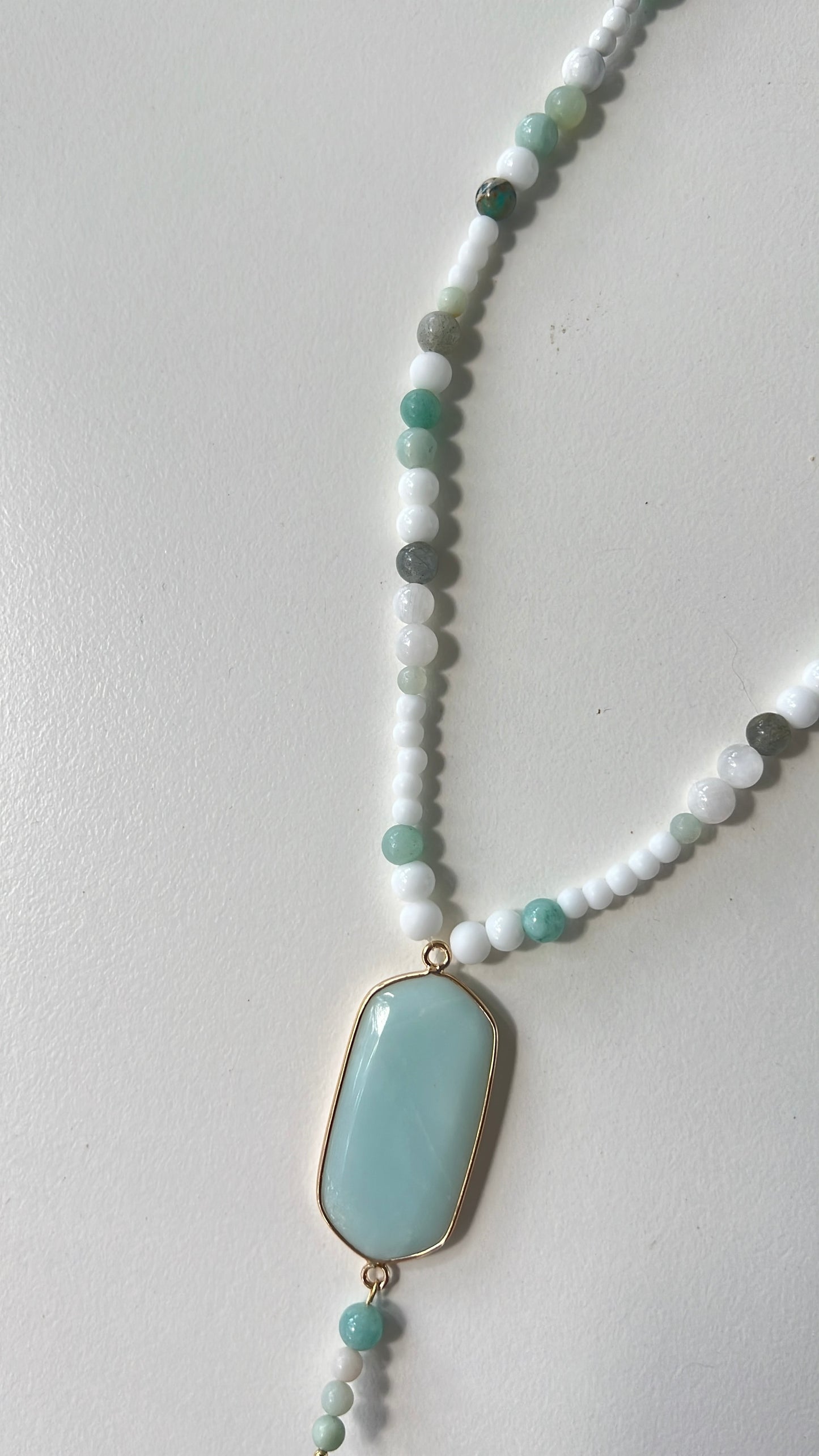 This beautifully crafted necklace combines amazonite, white agate, moonstone, and howlite to support self-expression, emotional harmony, and inner calm.