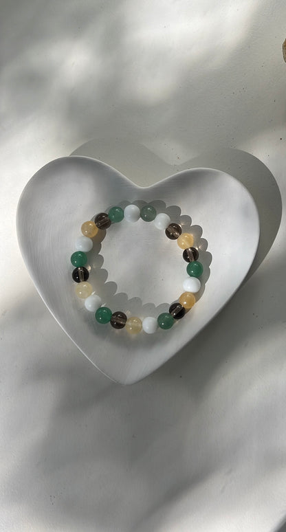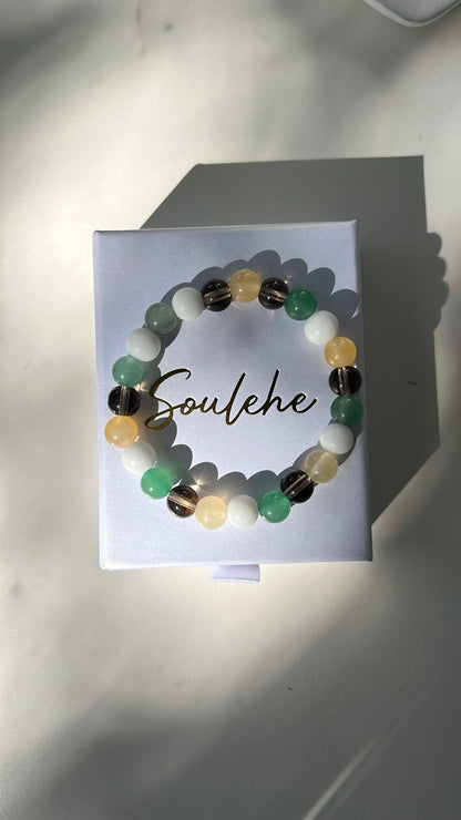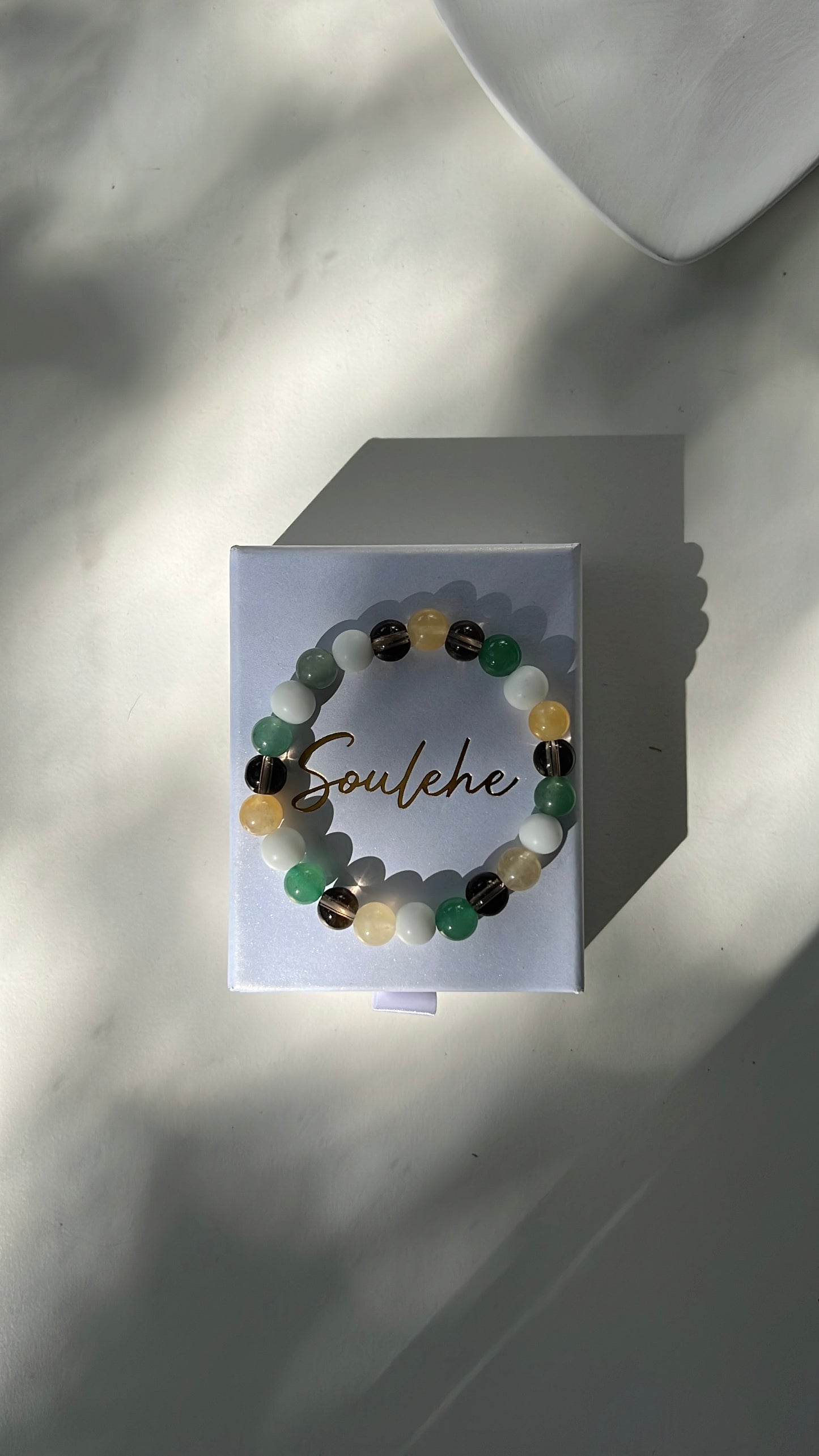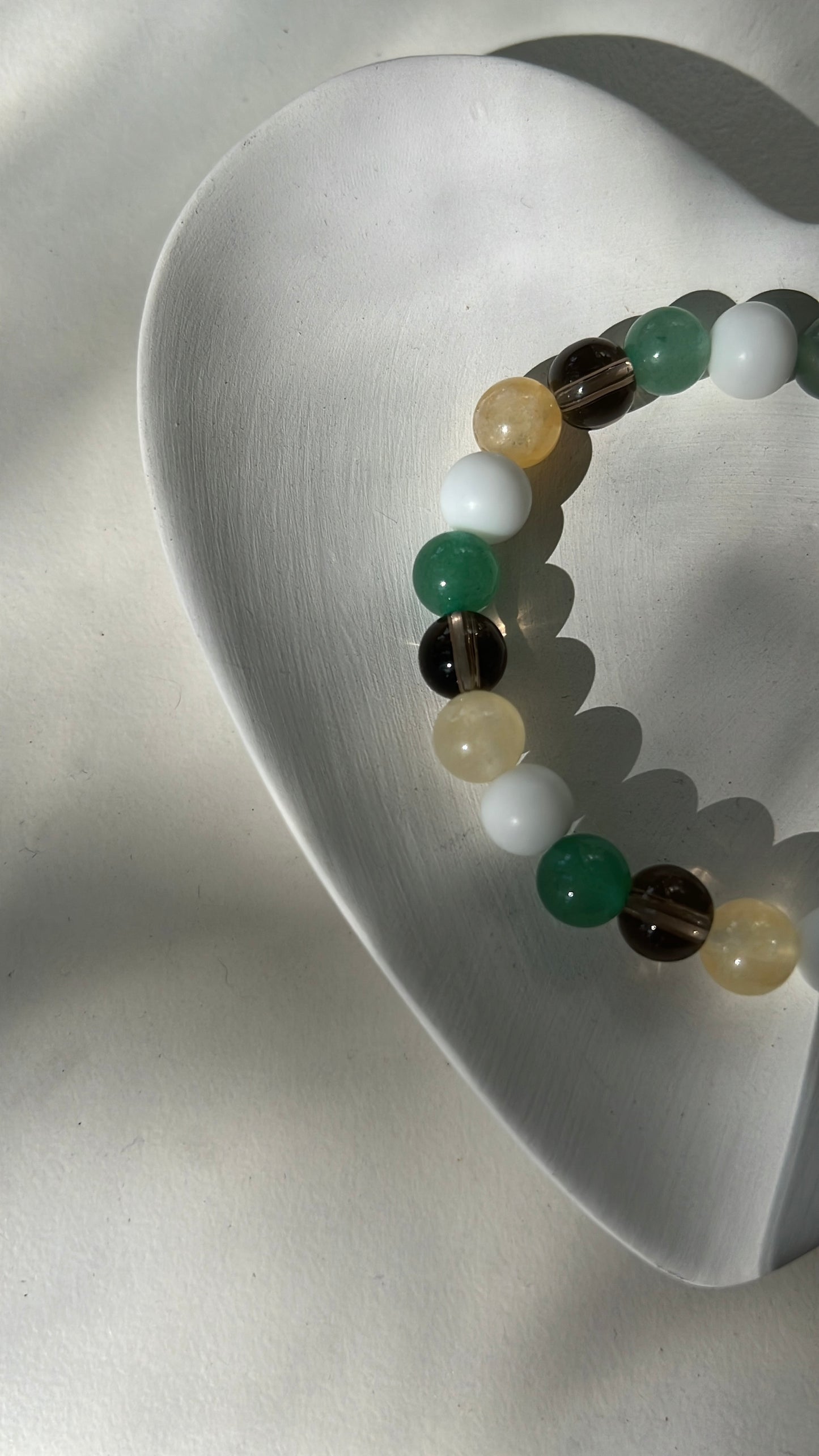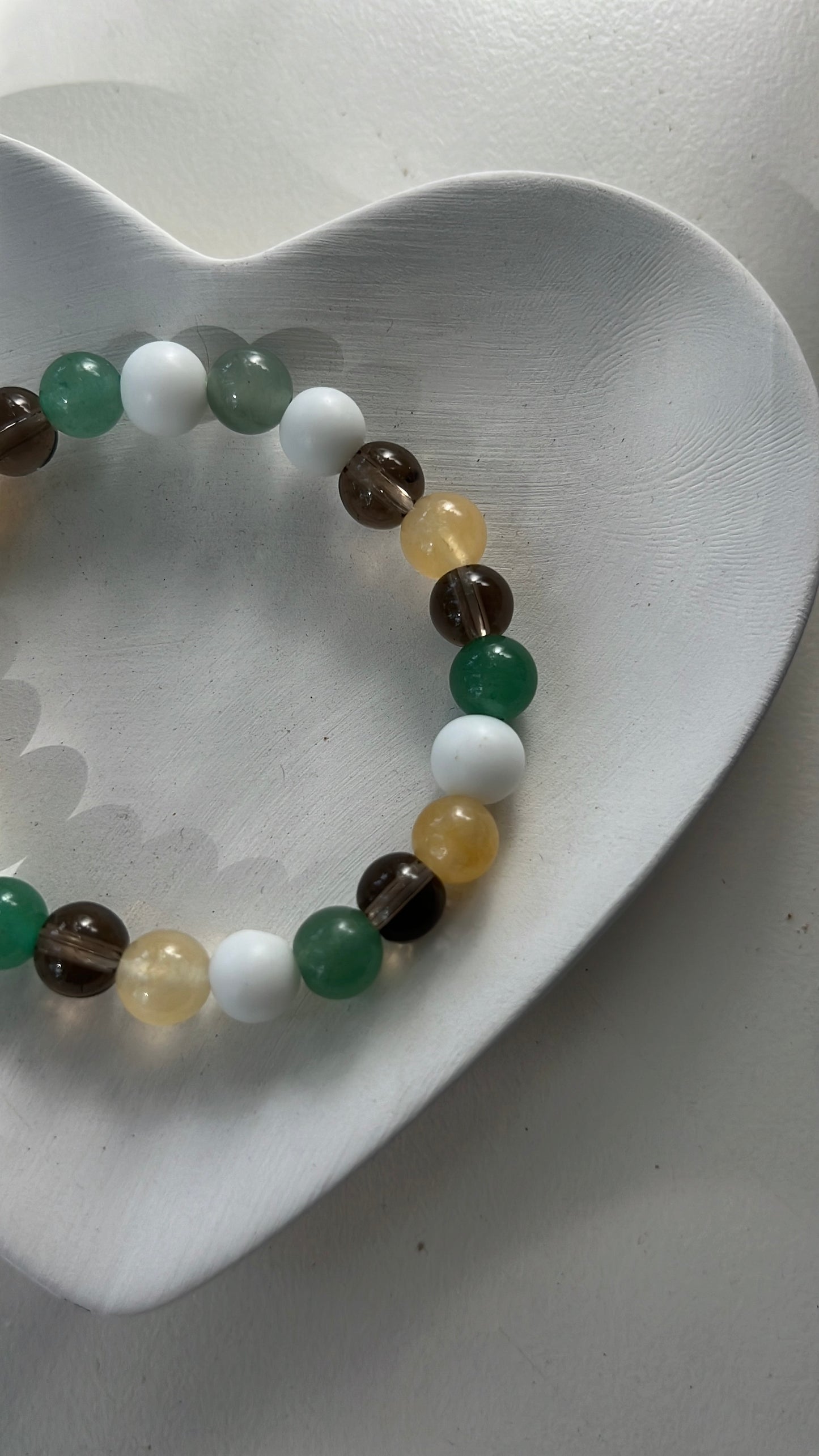 Citrine radiates positivity and self-belief, helping to manifest abundance and clarity. White Agate promotes balance and inner strength, fostering love and healing in relationships while offering protection. Green Aventurine invites luck, confidence, and joy, enhancing creativity and heart-centered peace. Smoky Quartz grounds and protects, clearing away negative energy and supporting prosperity and rational thinking.