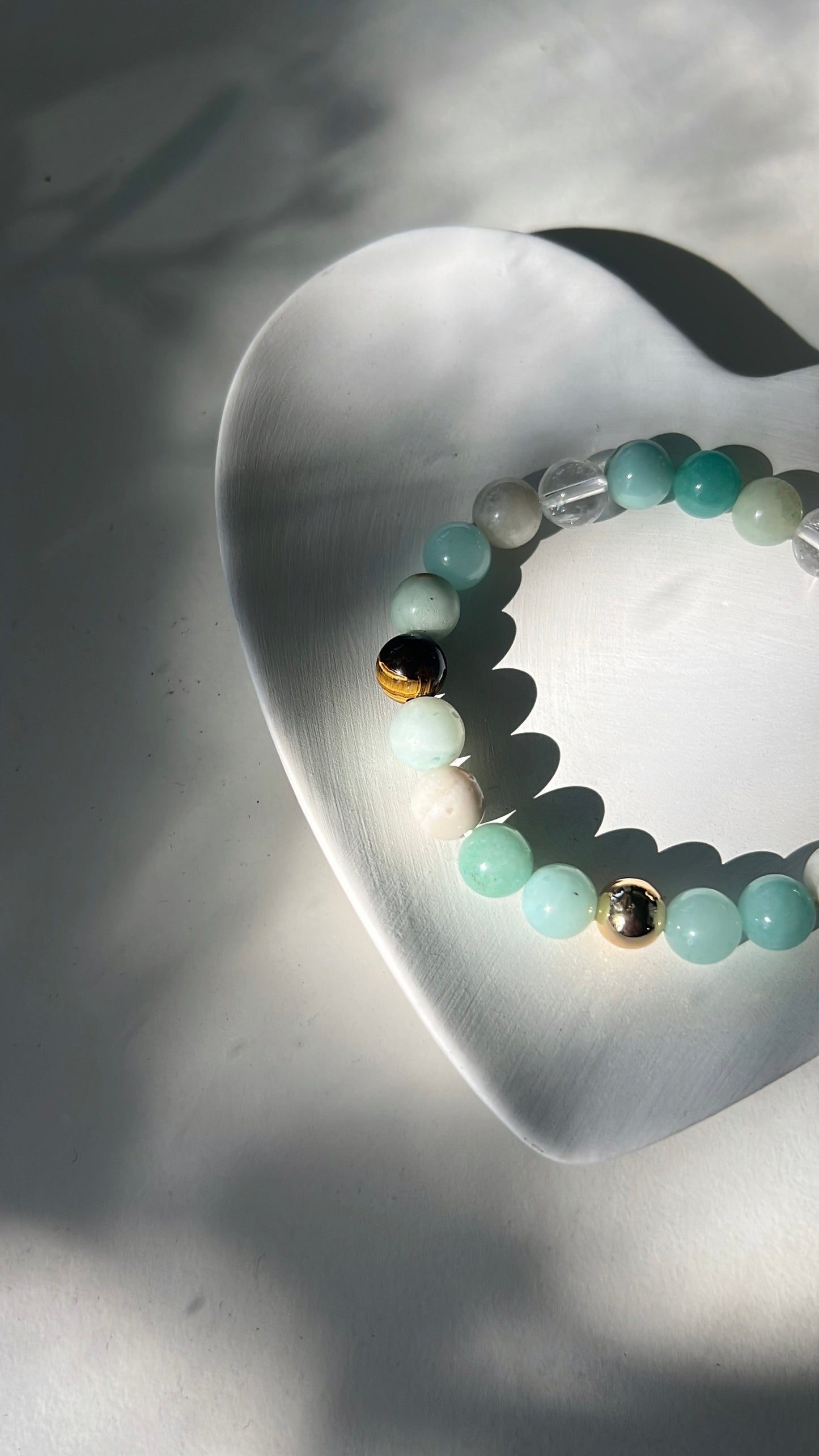 Designed for Leo , this bracelet combines Amazonite, Clear Quartz, and Tiger Eye—each stone supporting self-expression, strength, and focus.