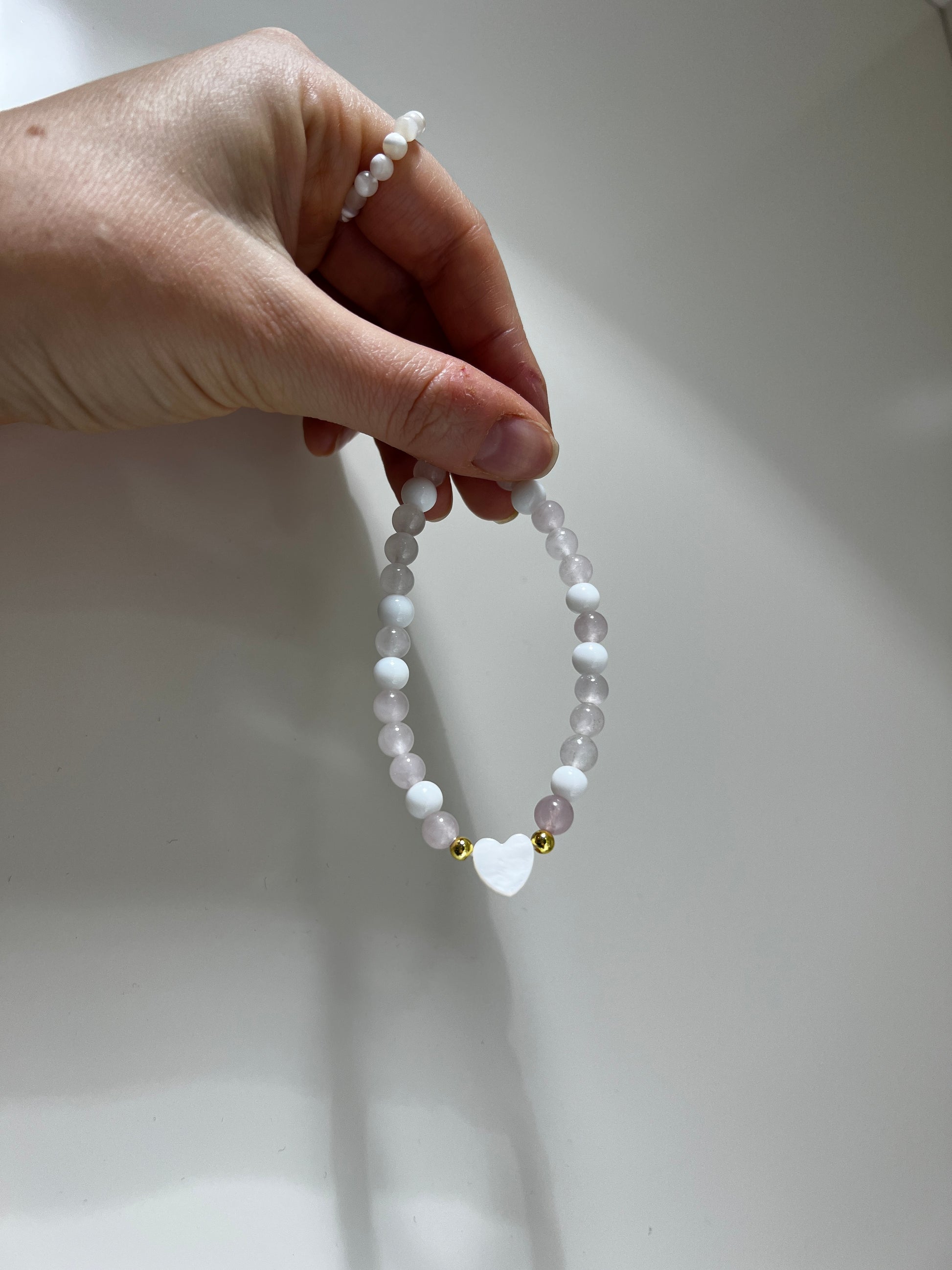 • Natural crystals Rose Quartz and White Agate 6mm • Gold filled beaded 4mm • Natural shell (heart)