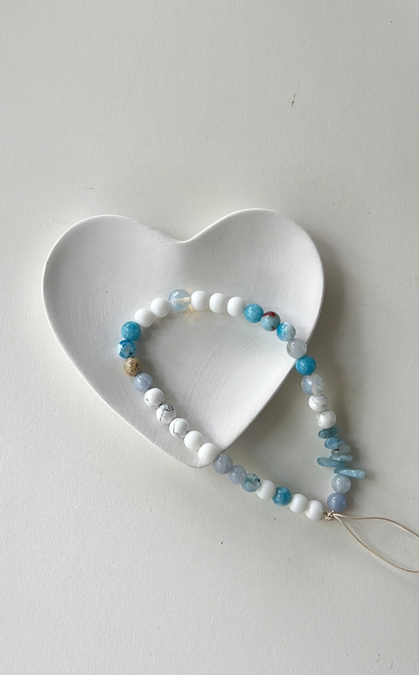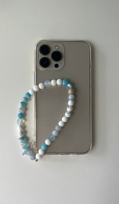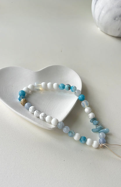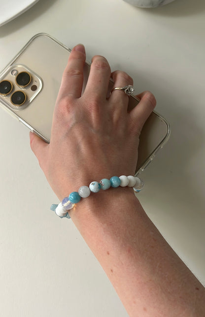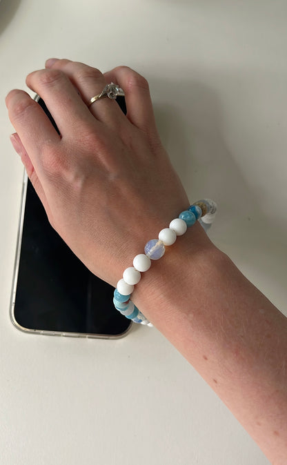 This phone bracelet combines the grounding and energizing qualities of blue snakeskin jasper, blue fire dragon stone, aquamarine, howlite, and white agate to support balance, joy, and emotional resilience throughout your day.