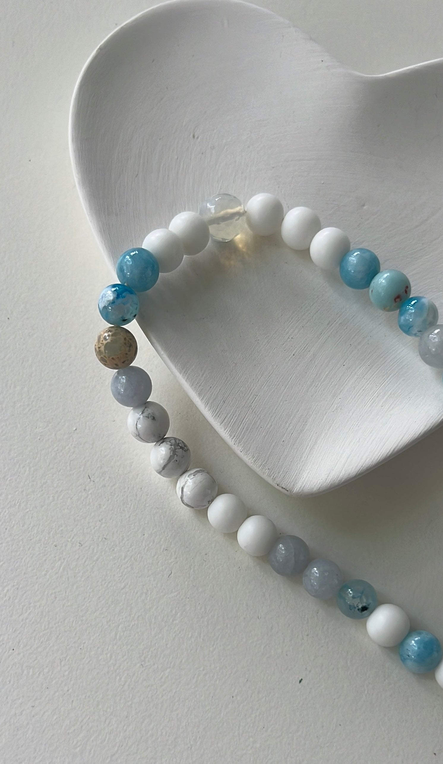 Blue snakeskin jasper aligns mind, body, and spirit, fostering inner peace and creativity. Blue fire dragon stone brings vitality and focus, enhancing life's pleasures and drive toward personal goals. Aquamarine adds calm and courage, reducing stress and enhancing relationships. Howlite supports peace of mind and self-love, while white agate offers protection and emotional strength.