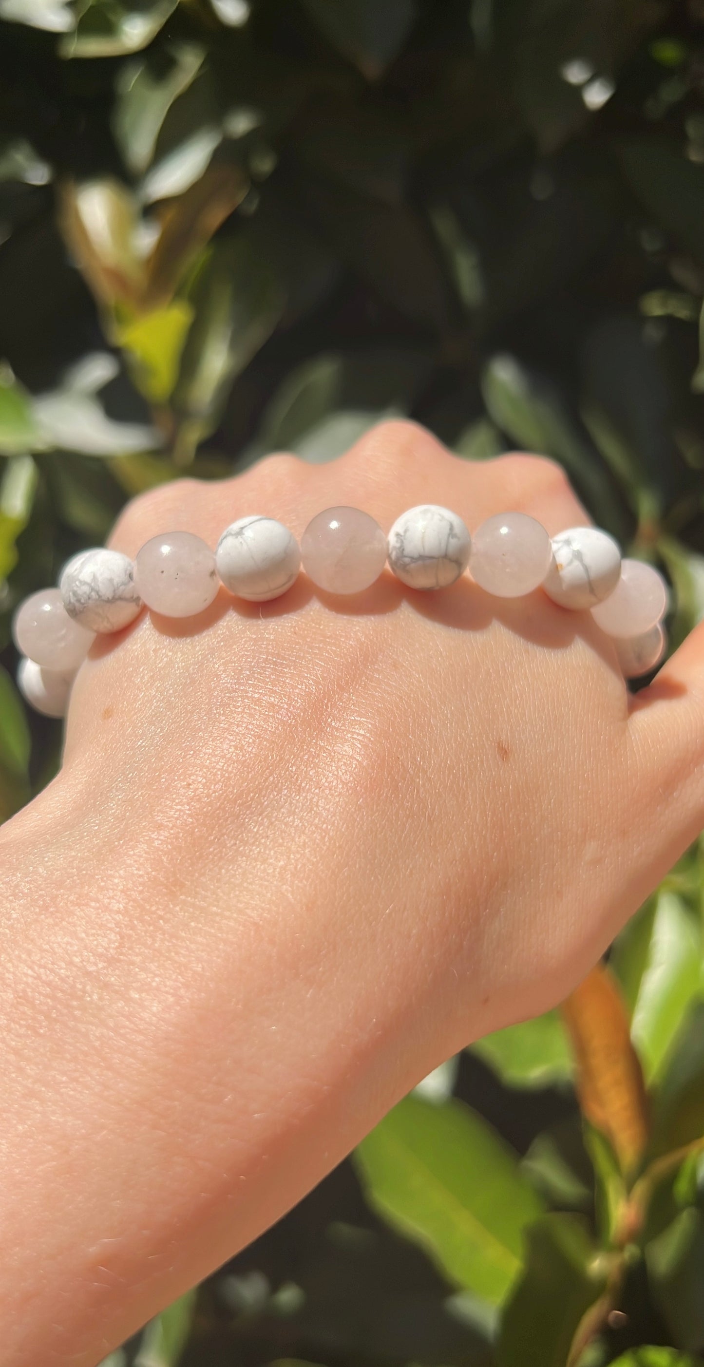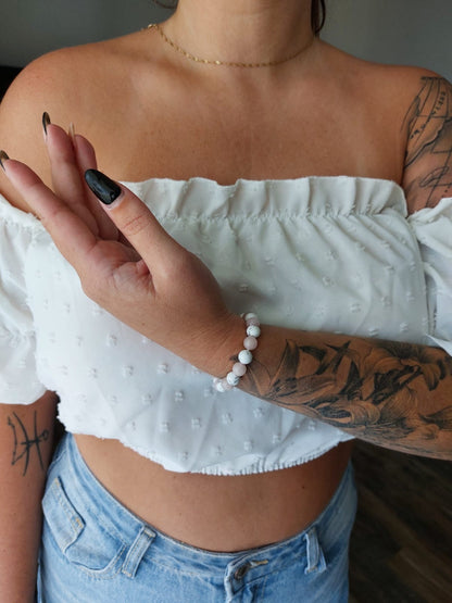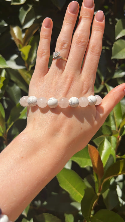 Discover peace and love with our Howlite and Rose Quartz Bracelet. Howlite calms stress and promotes restful sleep, while Rose Quartz nurtures love, harmony, and self-esteem.