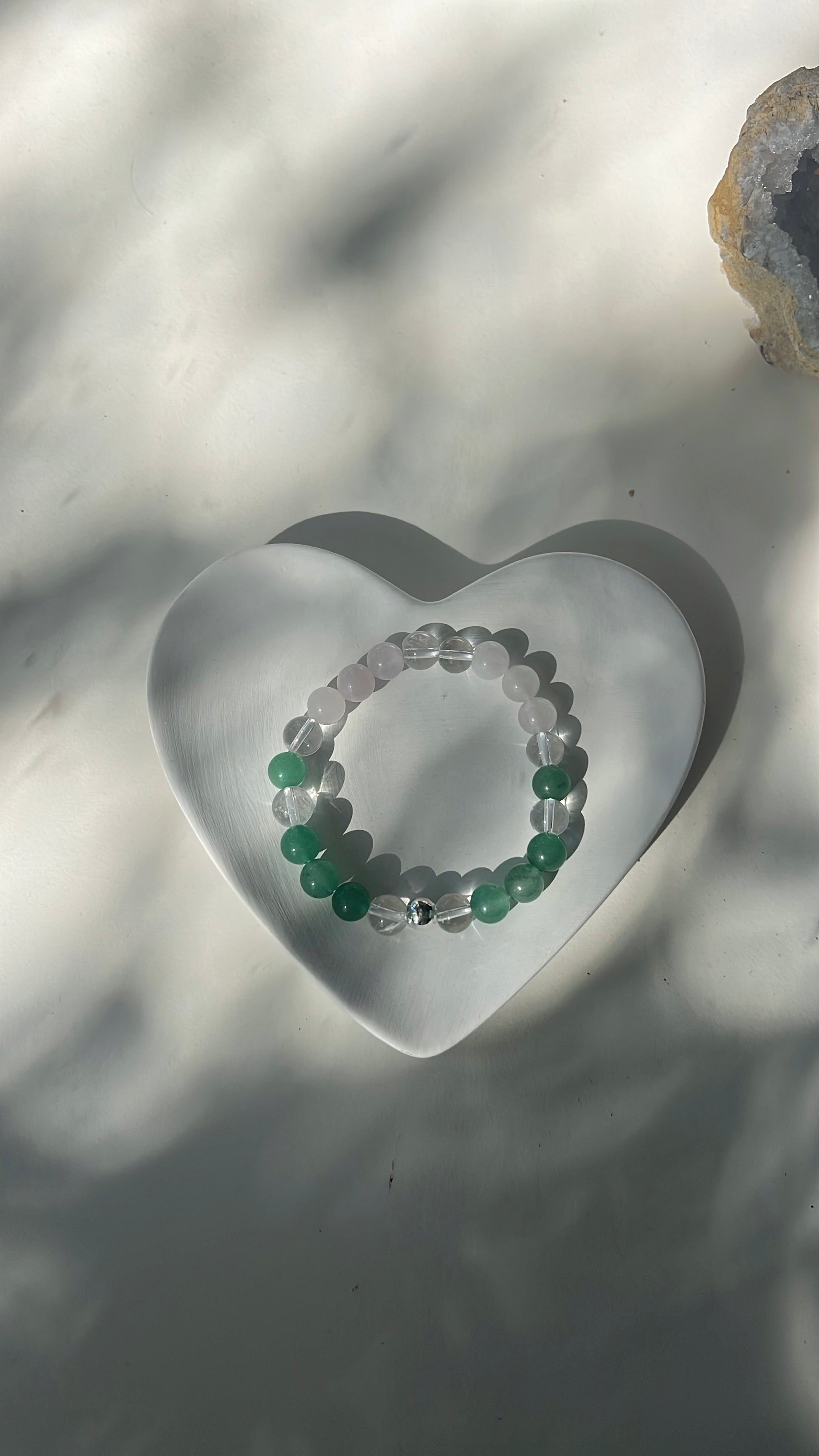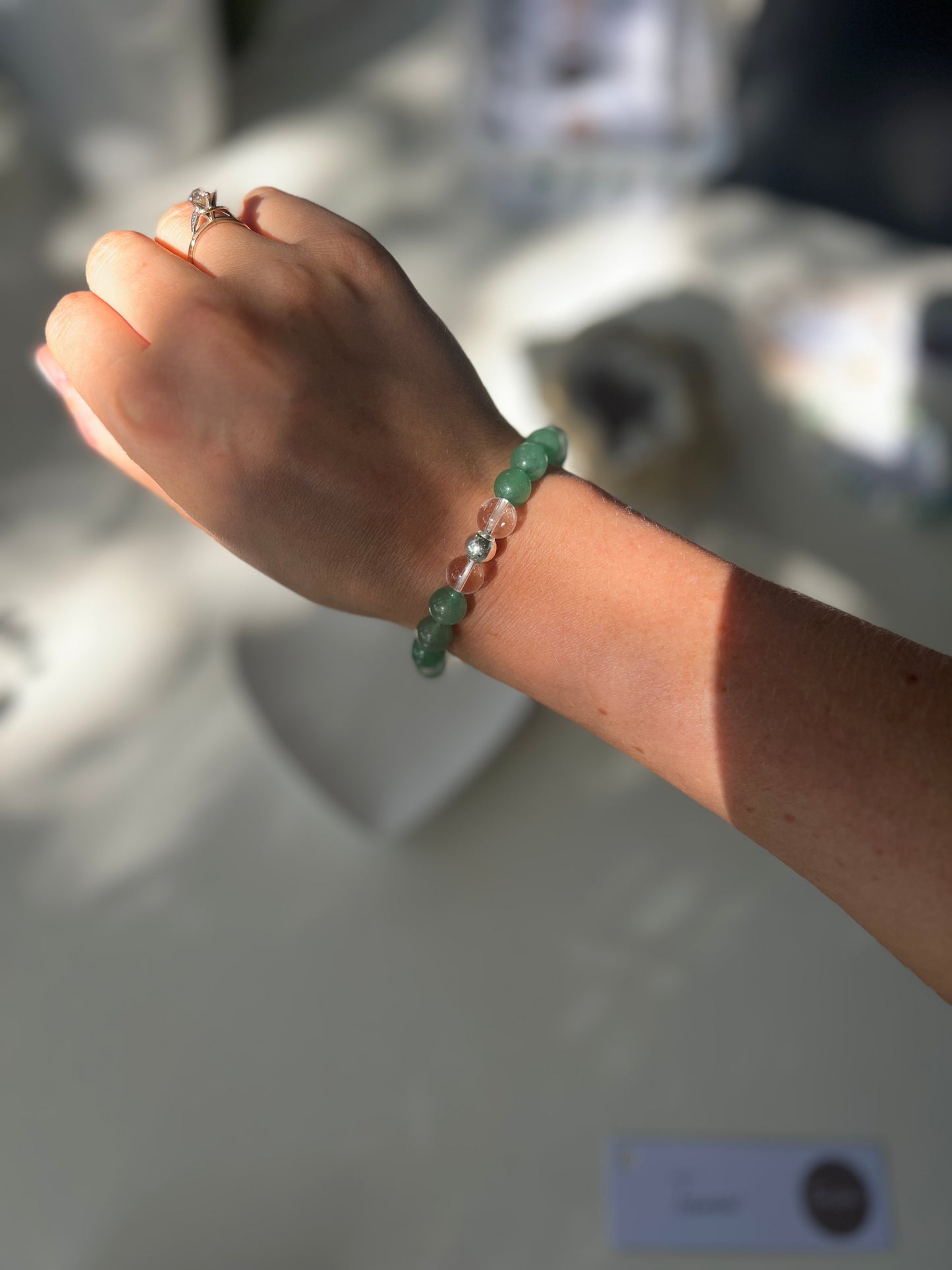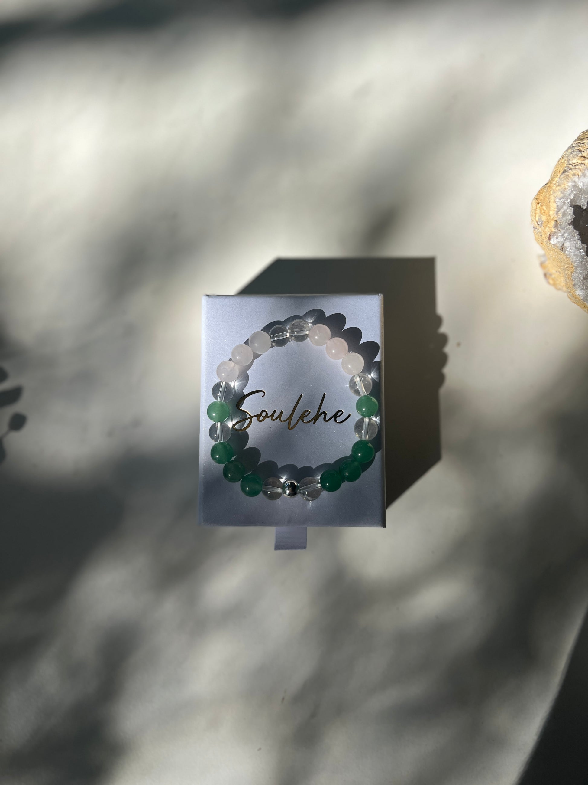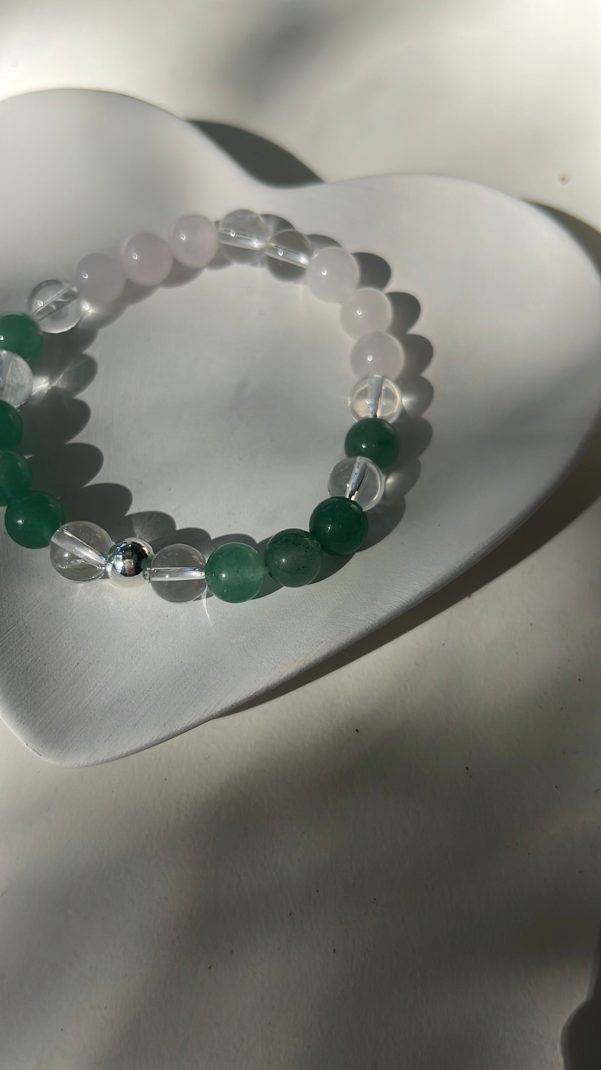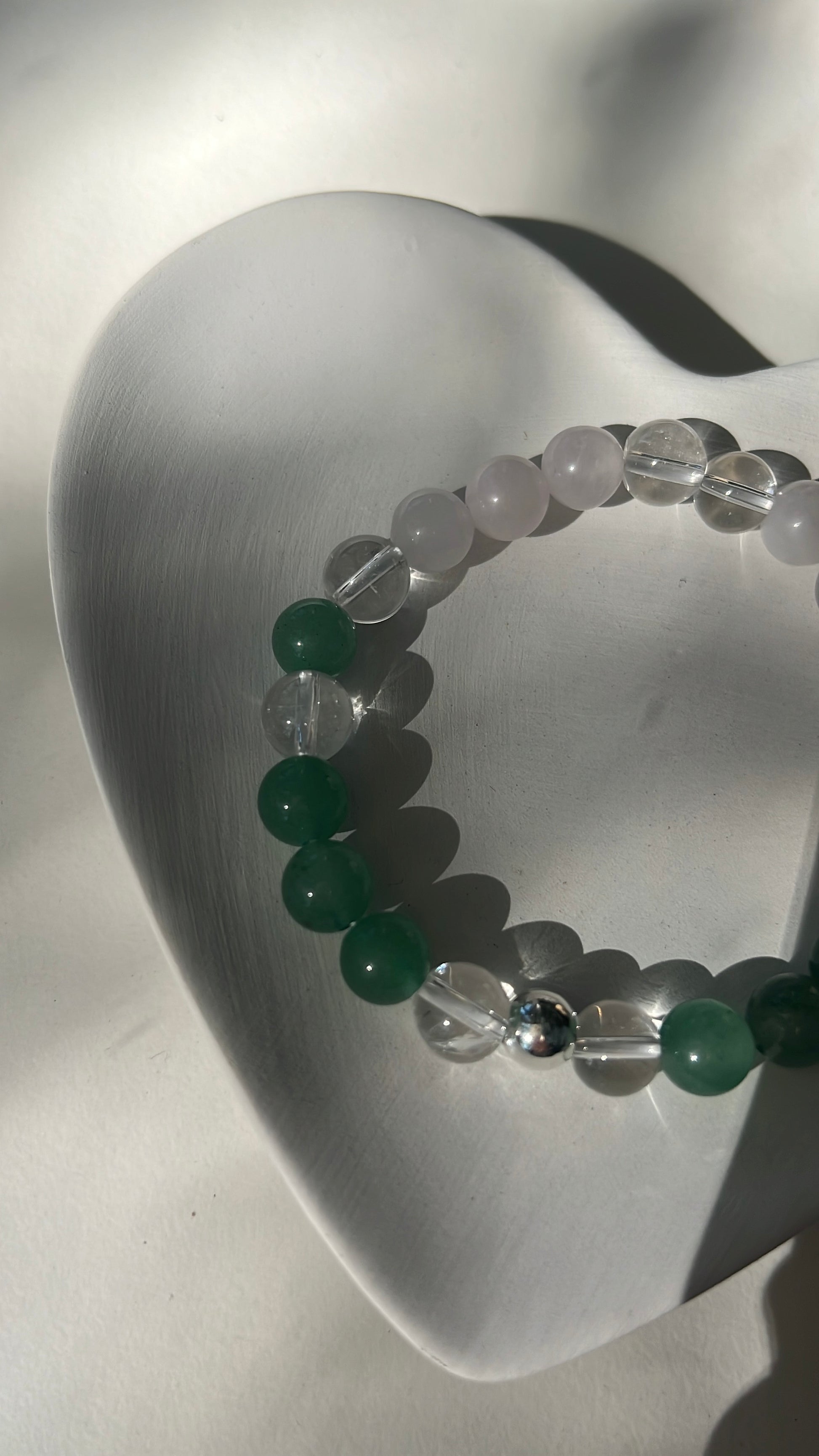 Designed for Taurus, this bracelet combines Rose Quartz, Green Aventurine, and Clear Quartz—stones known for enhancing love, prosperity, and personal power.