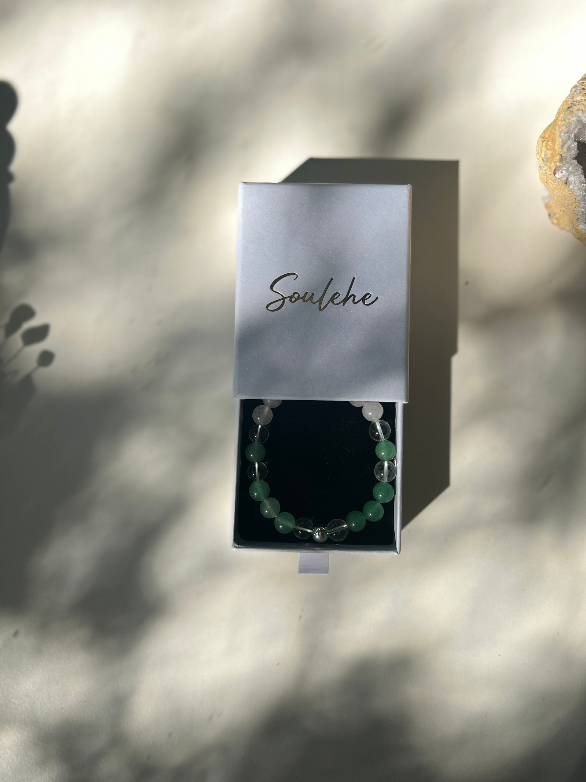 Rose Quartz fosters love, harmony, and self-esteem, bringing healing to the heart and encouraging emotional balance. Green Aventurine attracts luck and confidence, promoting prosperity and joy while offering protection and creativity. Clear Quartz amplifies energy and clarity, balancing the body’s energies and supporting spiritual growth.