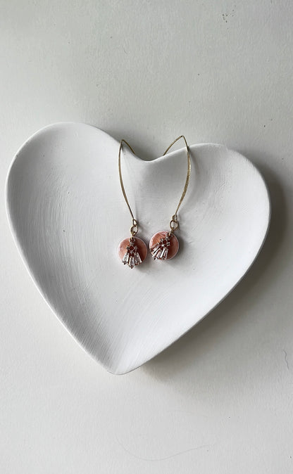 All of the Polymer Clay earrings are handcrafted. Some earrings may include gold or silver leaves, recycled make-up or a clear resin on them to give them a nice shine!