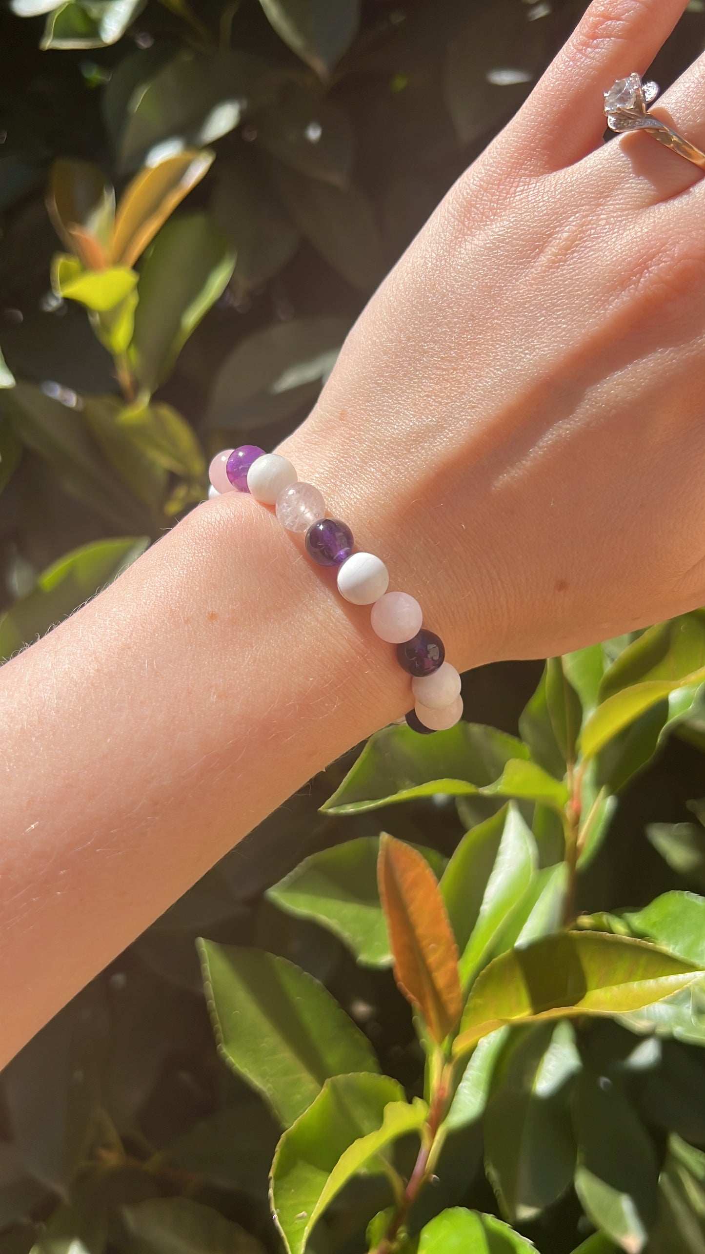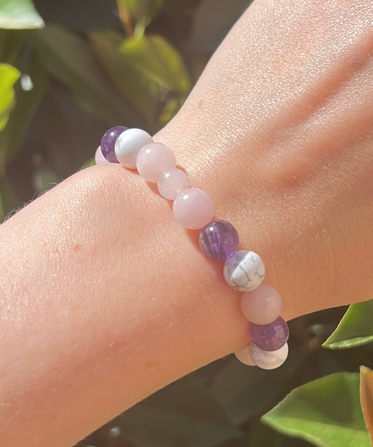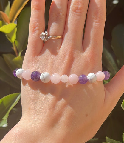 Embark on your journeys with the Travel Bracelet, a perfect fusion of Rose Quartz, Aquamarine, Amethyst, and Howlite.