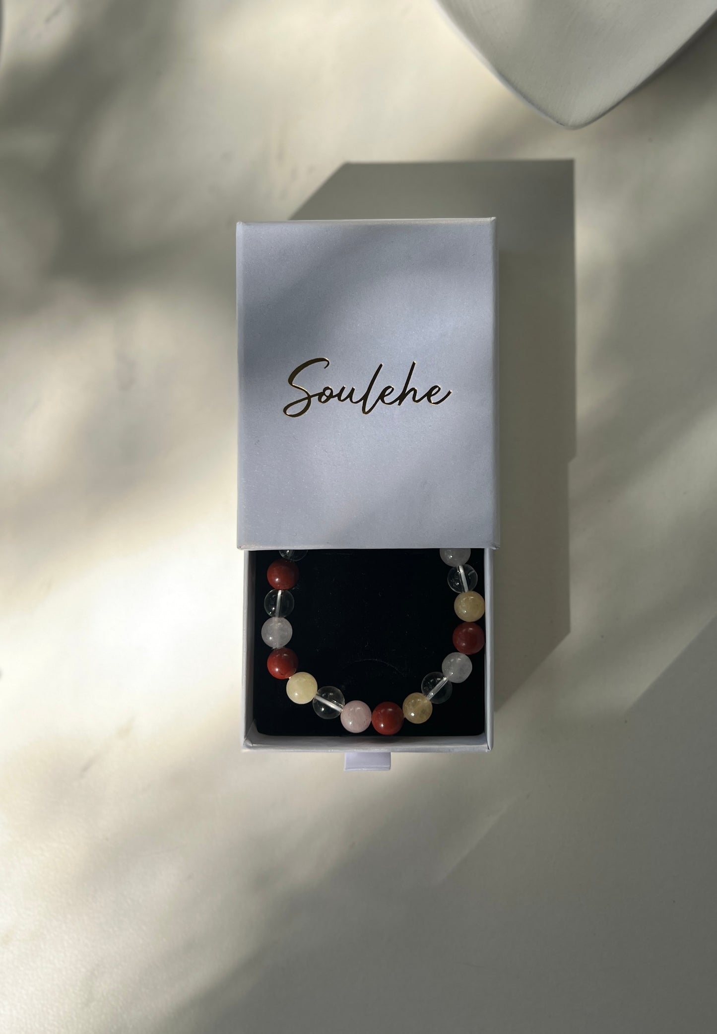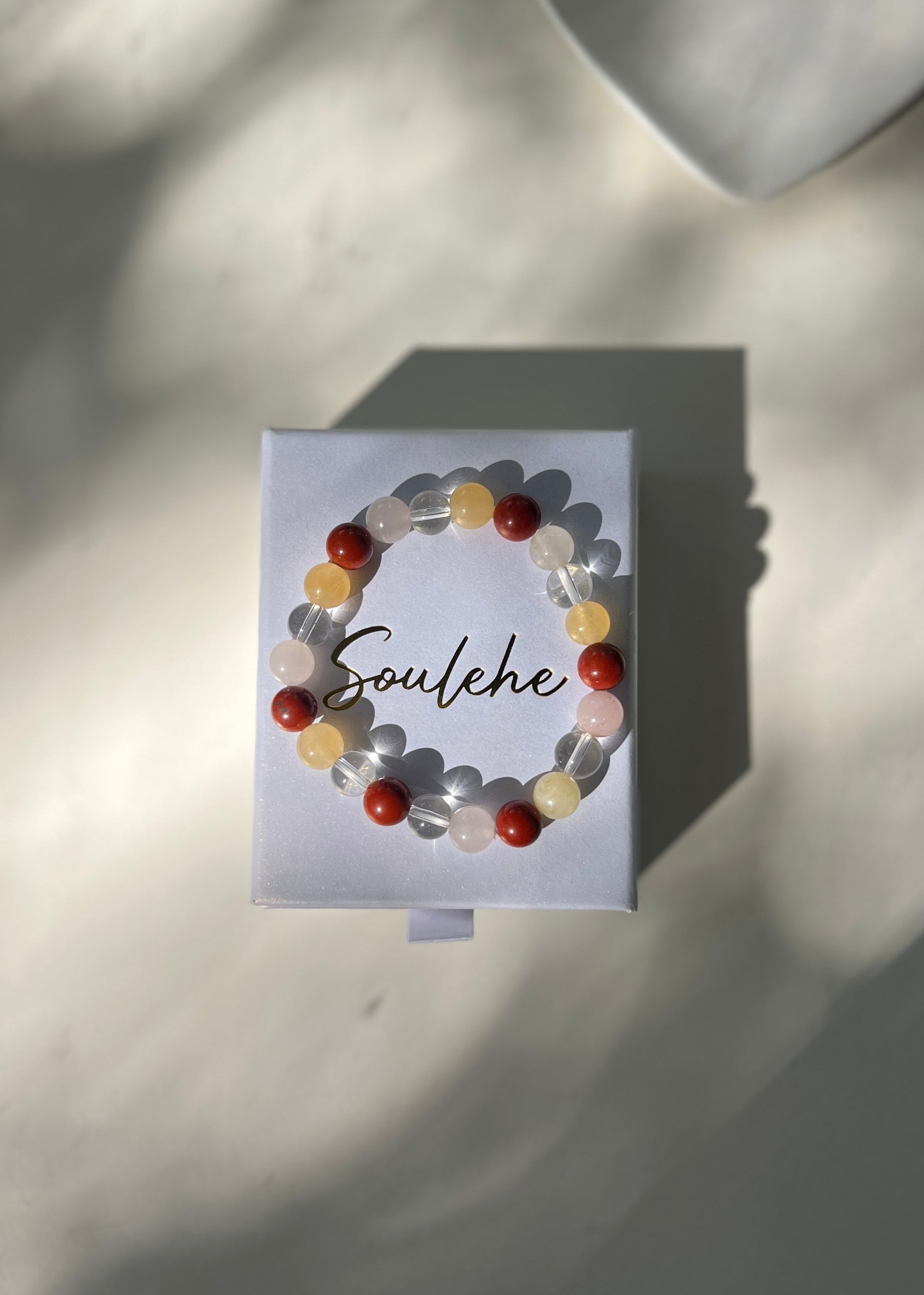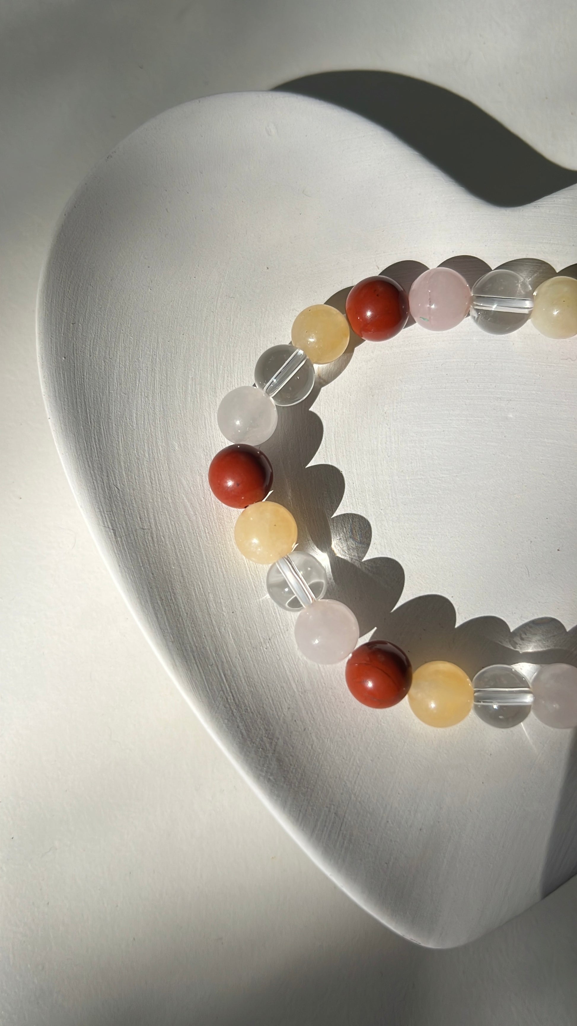 Citrine enhances positivity and self-belief, supporting abundance and clarity of purpose. Red Jasper provides grounding energy, offering protection, compassion, and focus while relieving anxiety and promoting relaxation. Clear Quartz amplifies personal power and spiritual growth, balancing energy and enhancing self-expression. Rose Quartz nurtures love, self-esteem, and harmony in relationships, soothing emotional wounds and promoting inner peace.