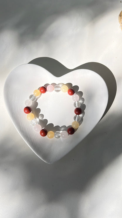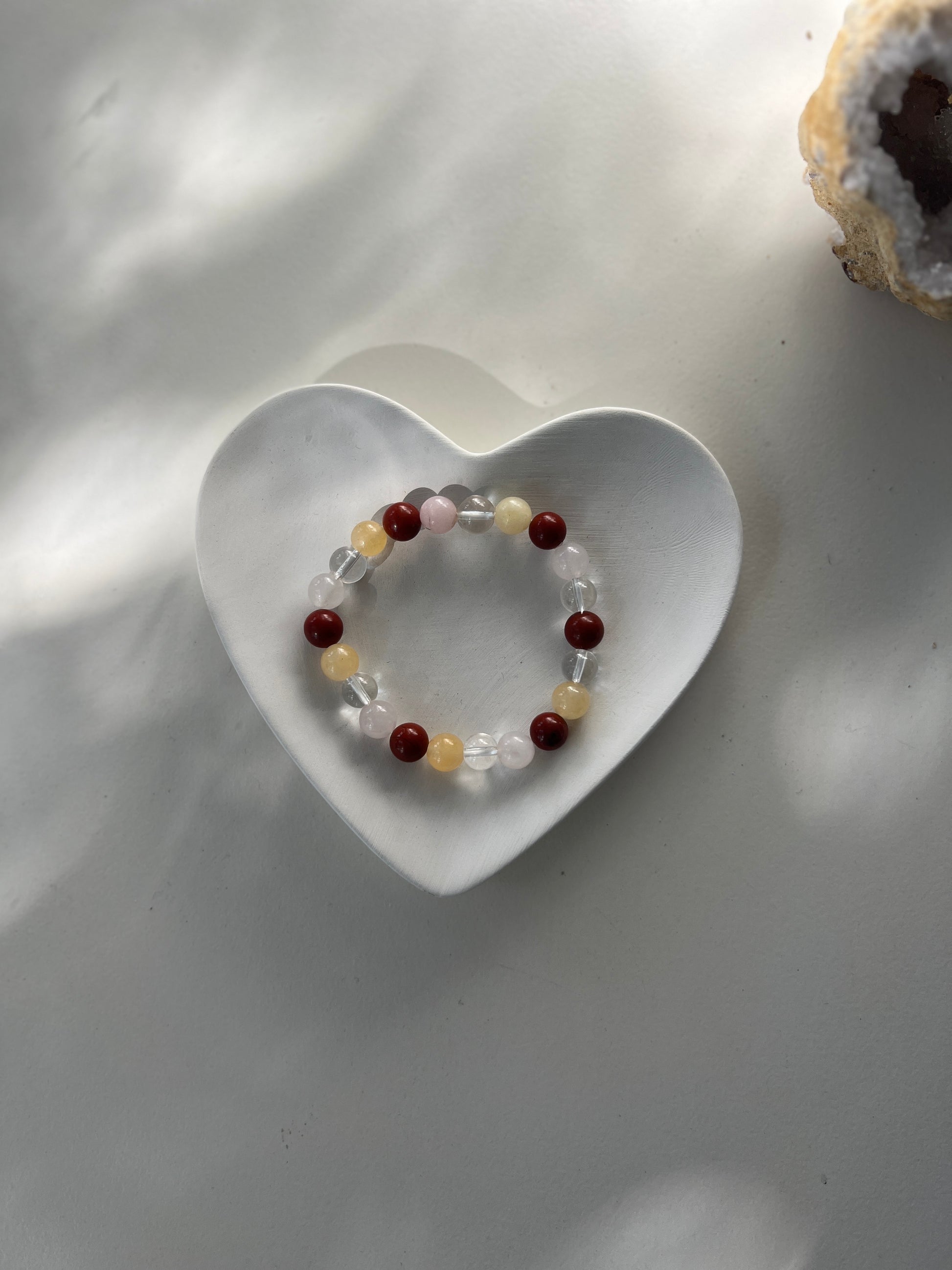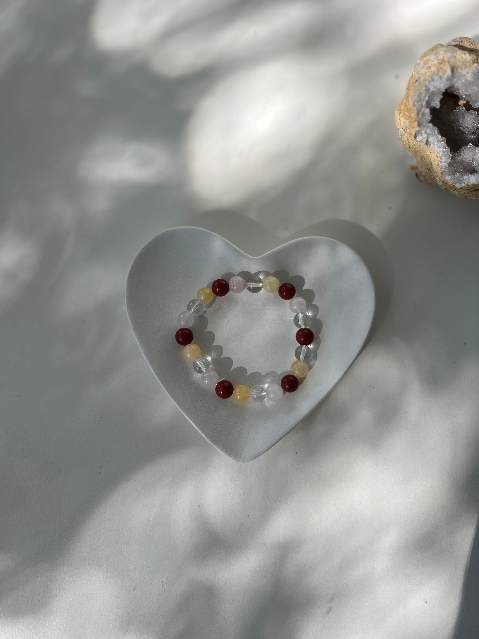 Citrine enhances positivity and self-belief, supporting abundance and clarity of purpose. Red Jasper provides grounding energy, offering protection, compassion, and focus while relieving anxiety and promoting relaxation. Clear Quartz amplifies personal power and spiritual growth, balancing energy and enhancing self-expression. Rose Quartz nurtures love, self-esteem, and harmony in relationships, soothing emotional wounds and promoting inner peace.