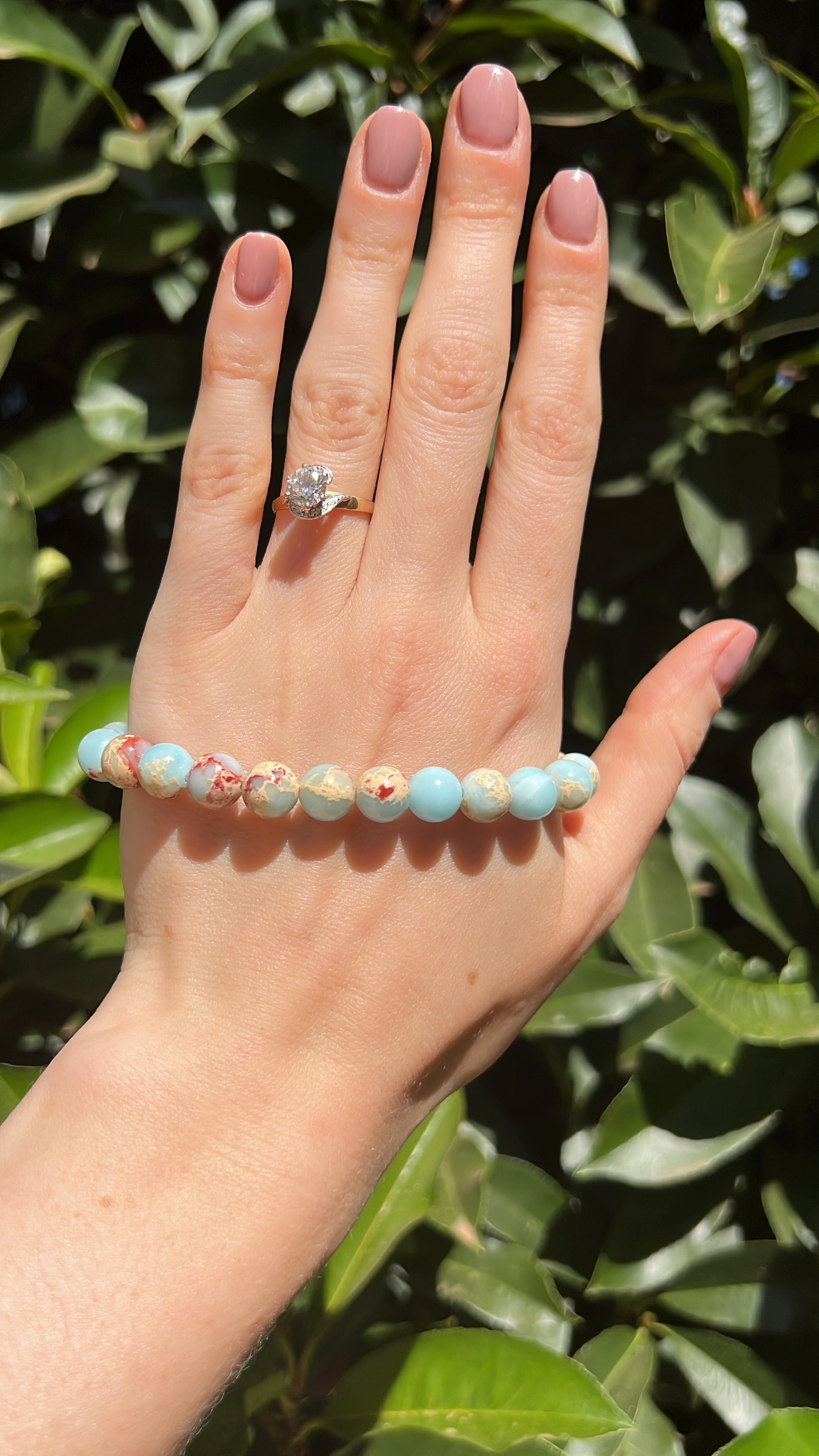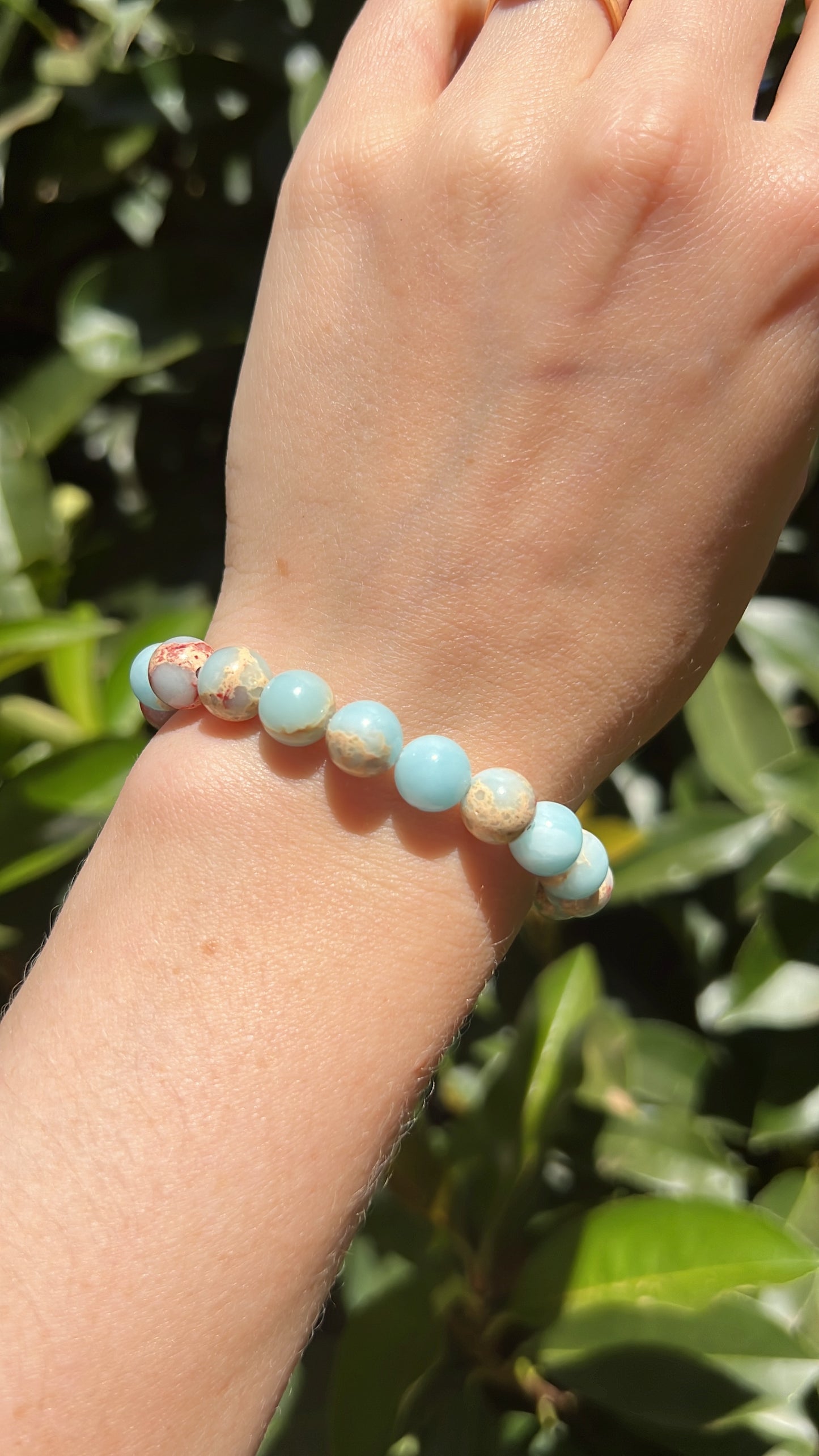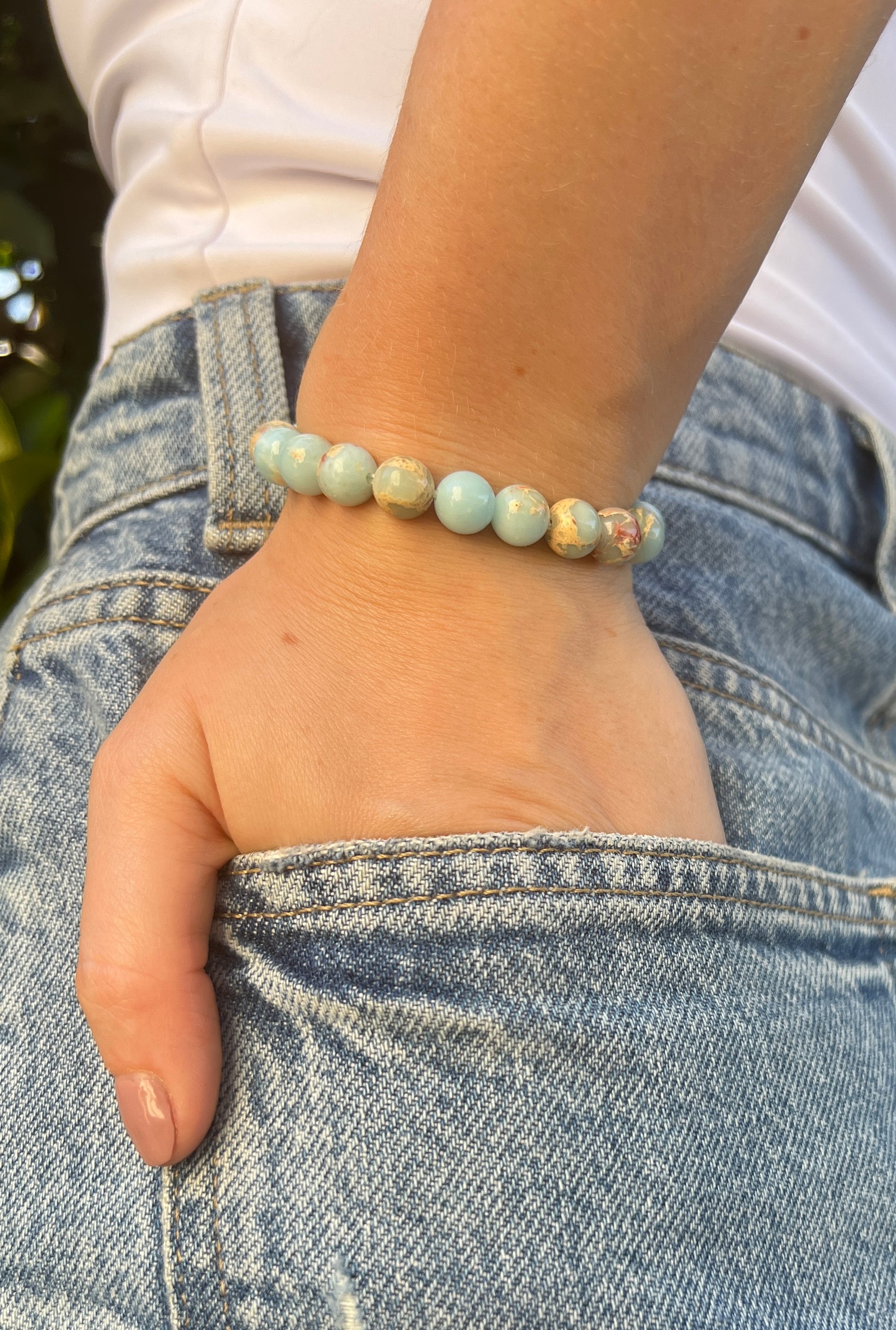 Wrap your wrist in the serene beauty of this Blue Snakeskin Jasper bracelet, a piece that perfectly embodies balance and harmony. Known for its ability to align the mind, body, and spirit, this bracelet promotes an atmosphere of peace and clarity.