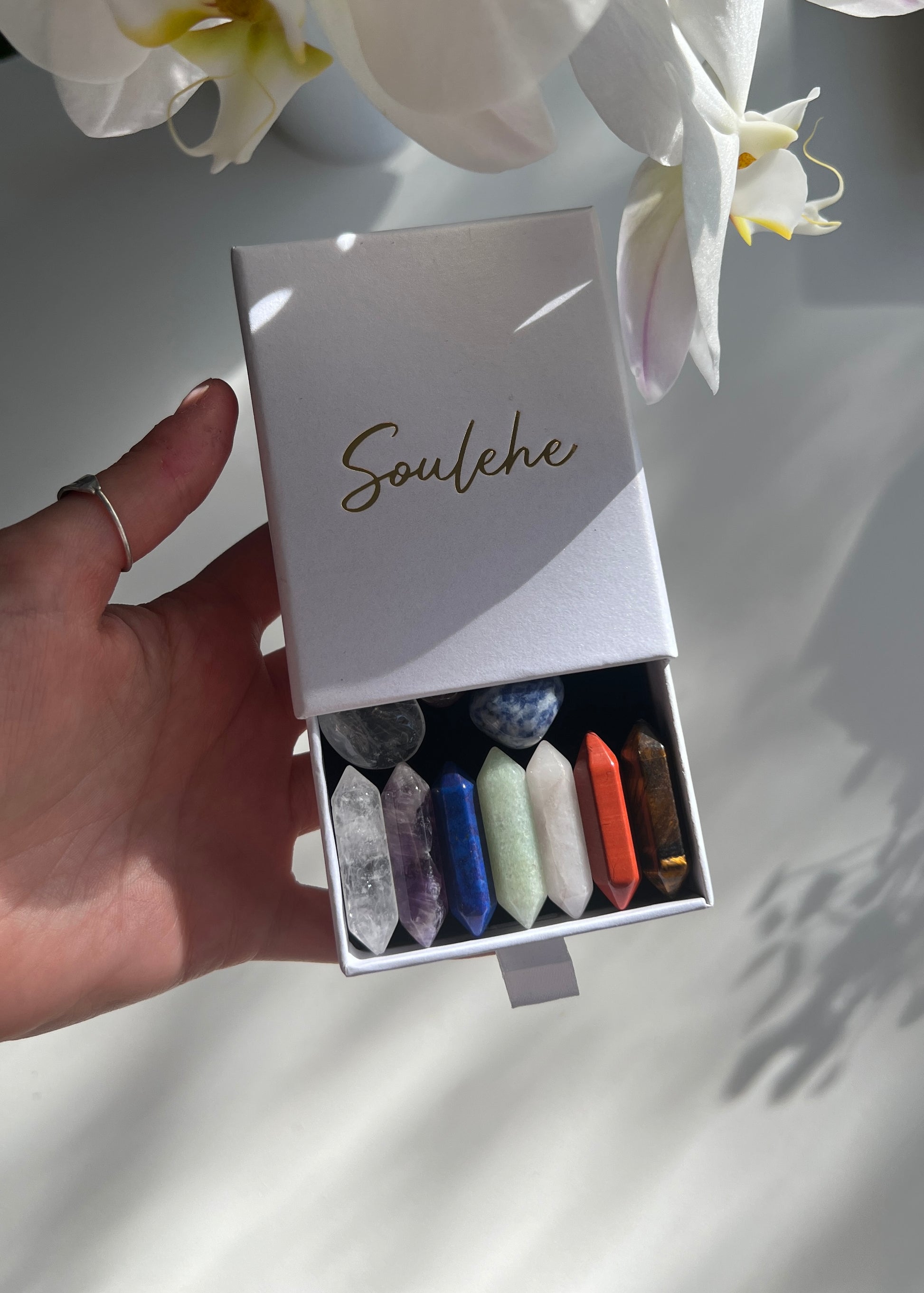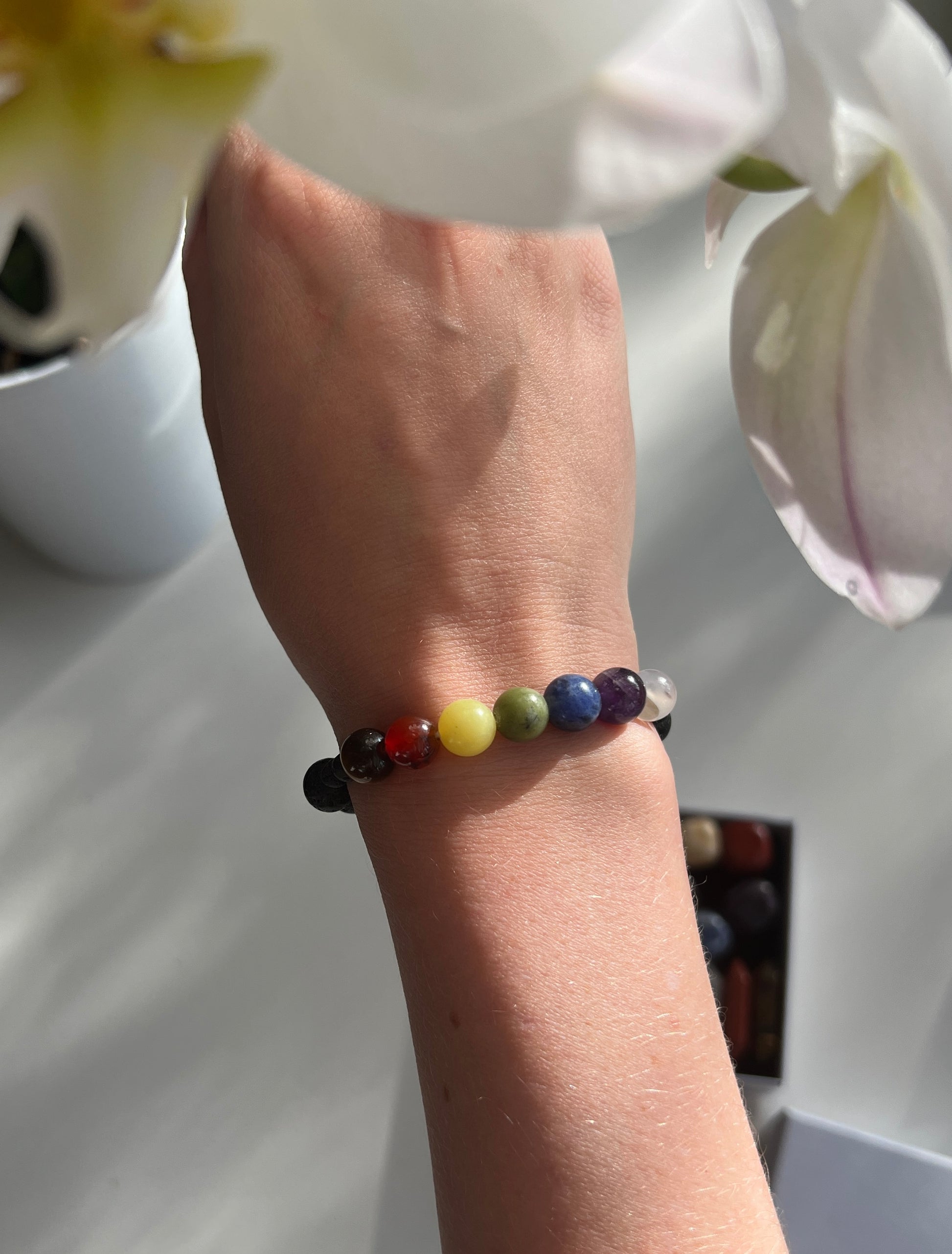 This bracelet includes crystals that support each of the seven main chakras: Root, Sacral, Solar Plexus, Heart, Throat, Third Eye, and Crown. Each crystal in the bracelet is chosen to influence a specific chakra, promoting energetic balance in your etheric body.