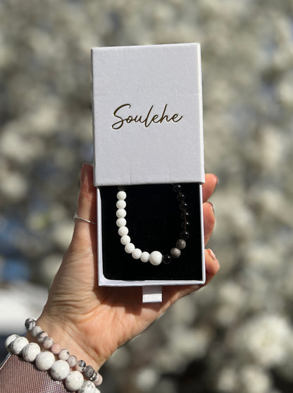 Obsidian is known for its grounding properties and ability to clear negativity, promoting truth and spiritual connection. White Agate symbolizes balance, strength, and protection against negative energies, helping to overcome heartache. Together, they create a harmonious piece that embodies therapy, love, and inner strength. Wear it to inspire positivity and resilience every day.