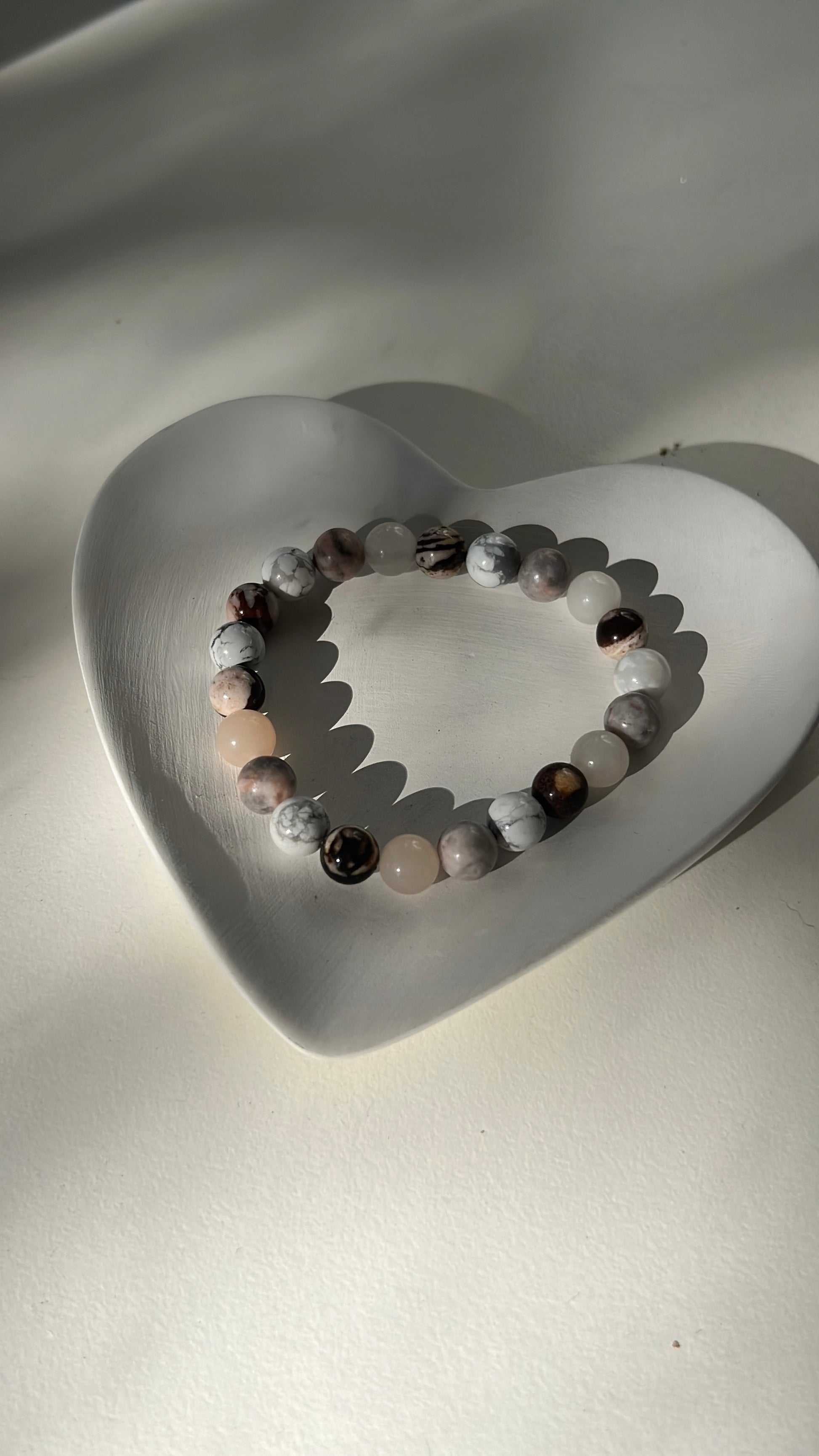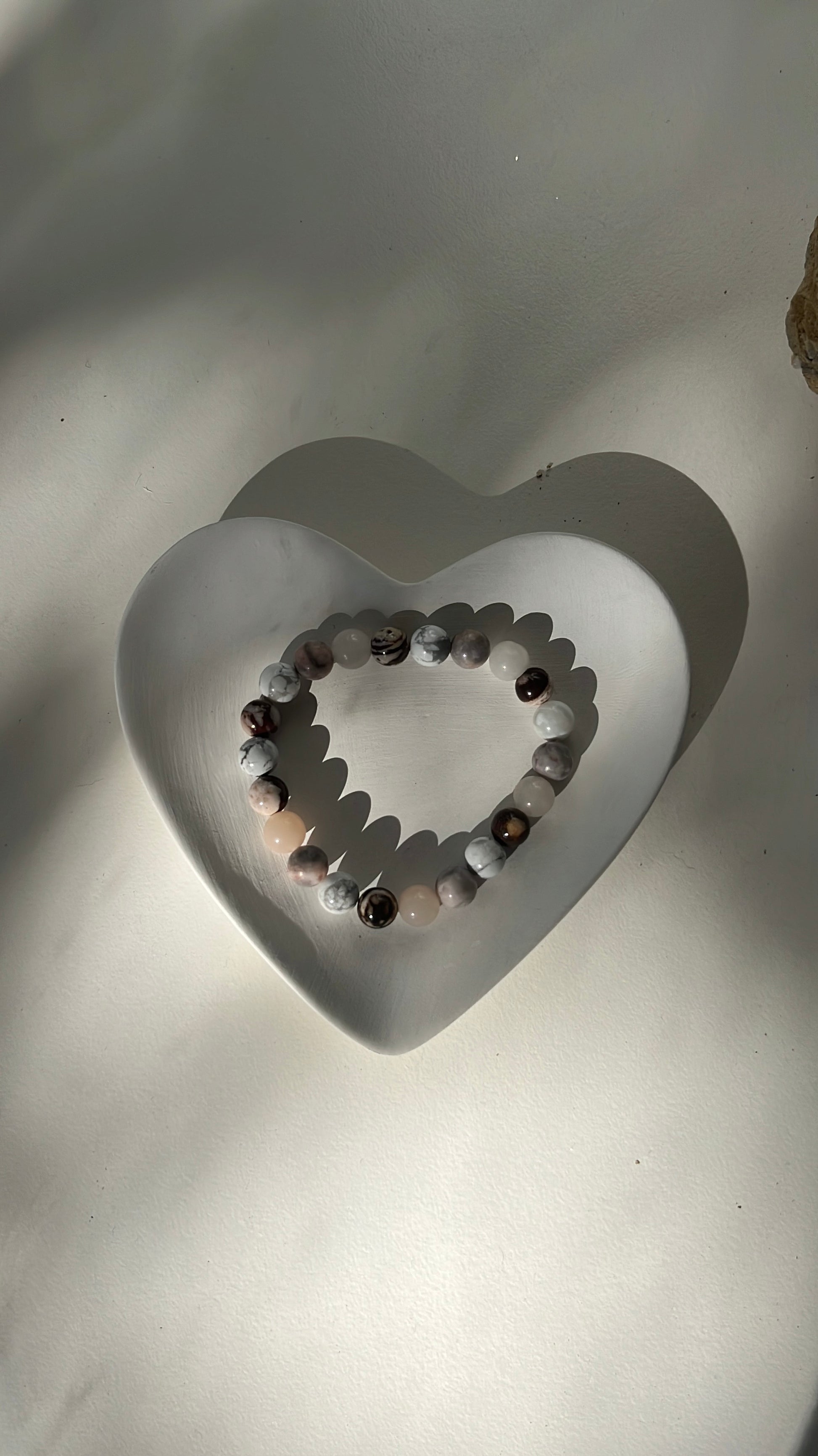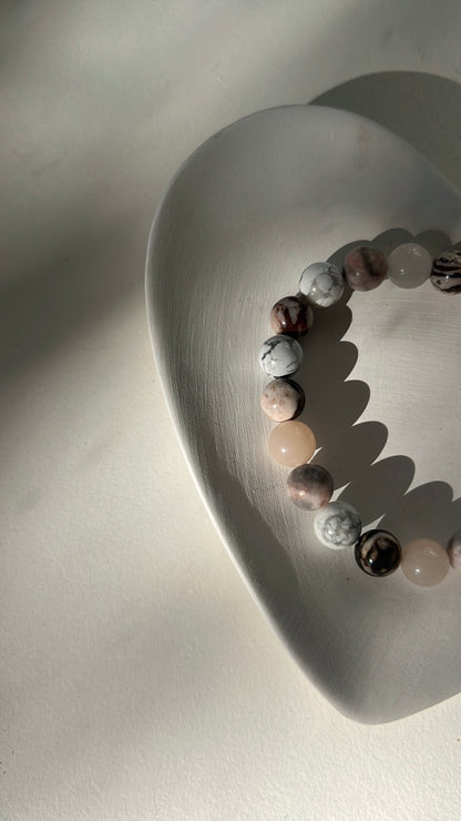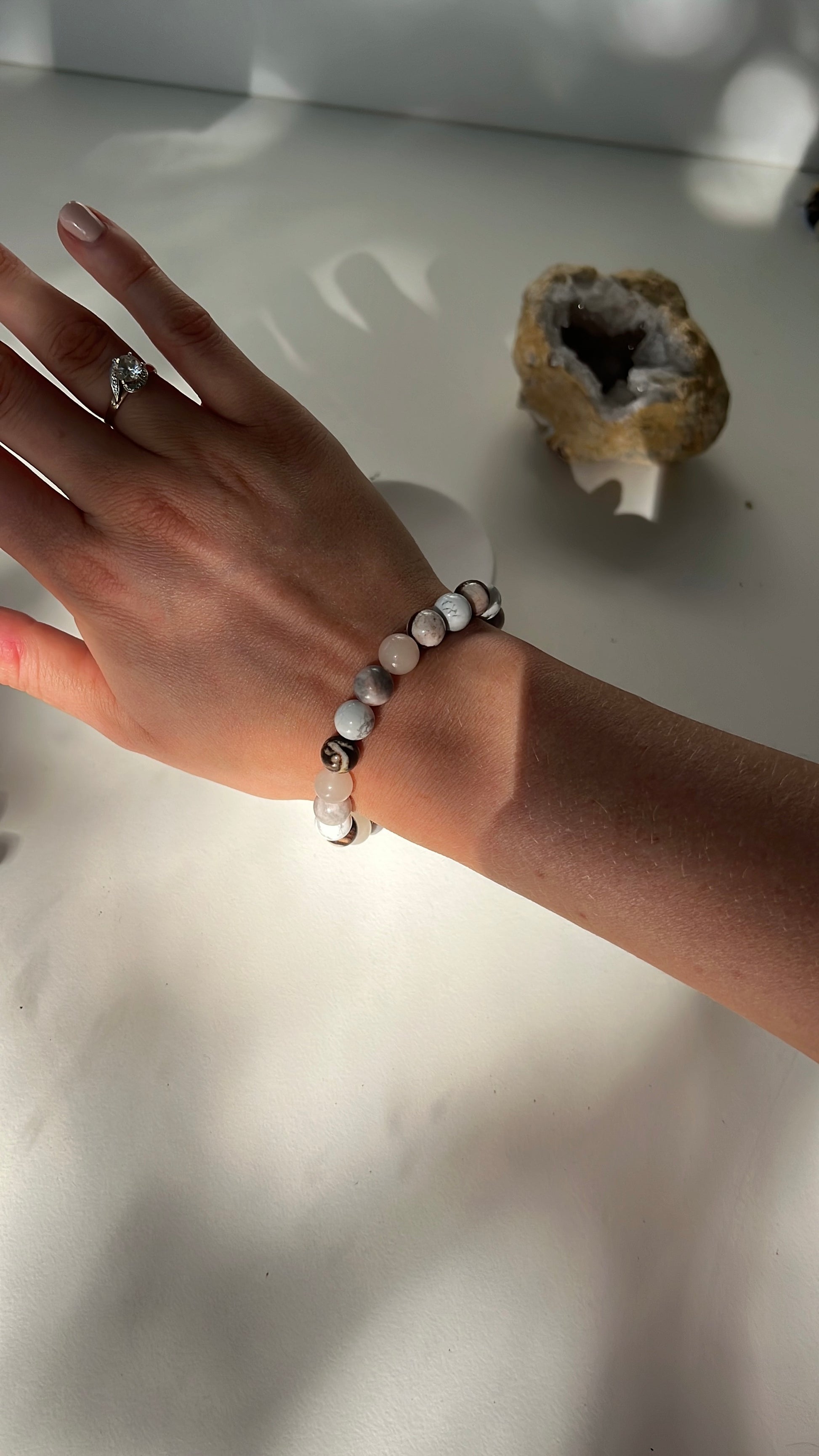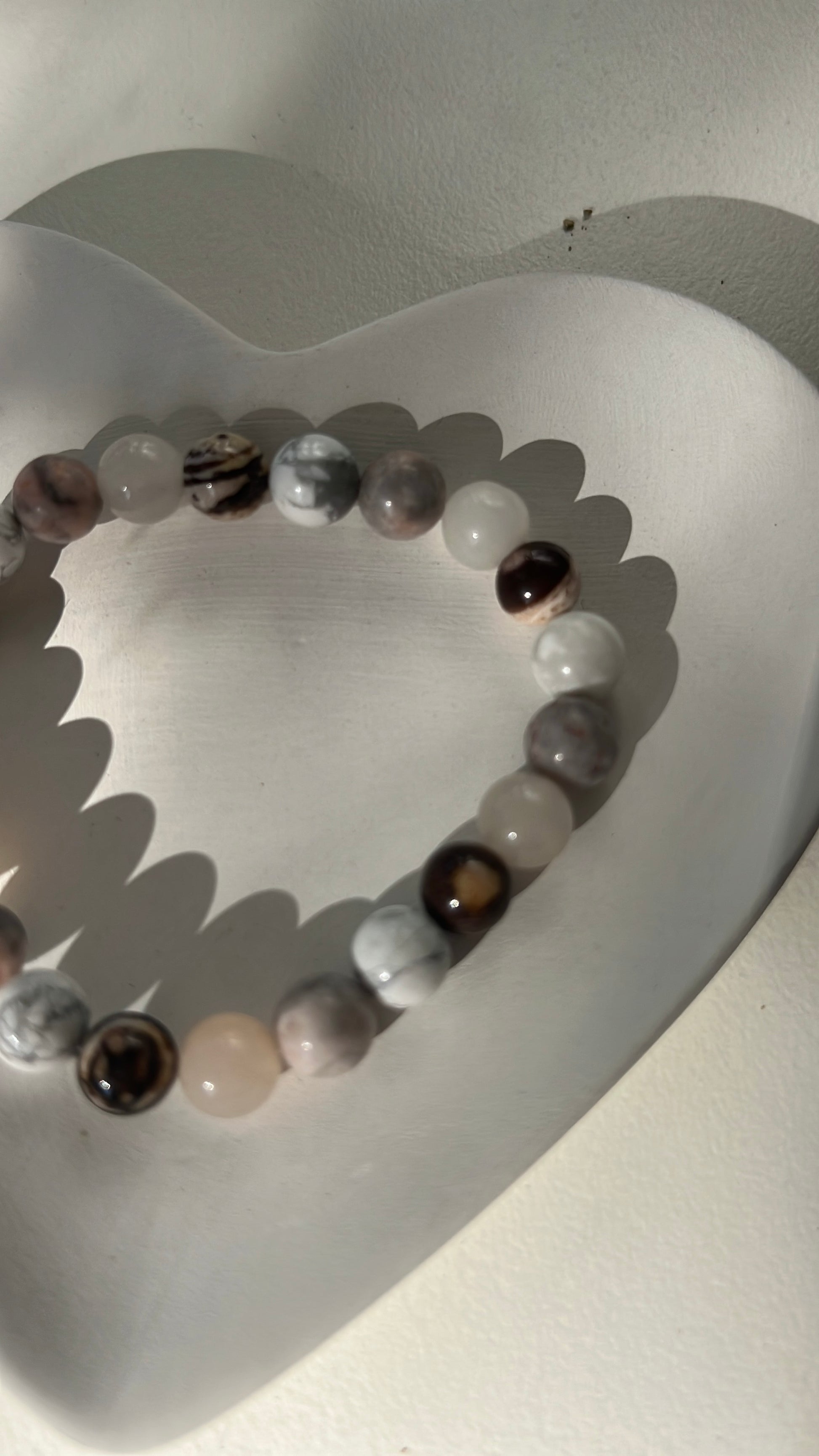 Howlite promotes peace and reduces stress, supporting self-love and calm communication. Australia Zebra stone provides balance and energetic cleansing, enhancing courage and determination. Pink Zebra balances male and female energies, helps maintain optimism, and offers grounding and protection. Pink Aventurine brings happiness and compassion, boosting creativity and wisdom while easing worries.