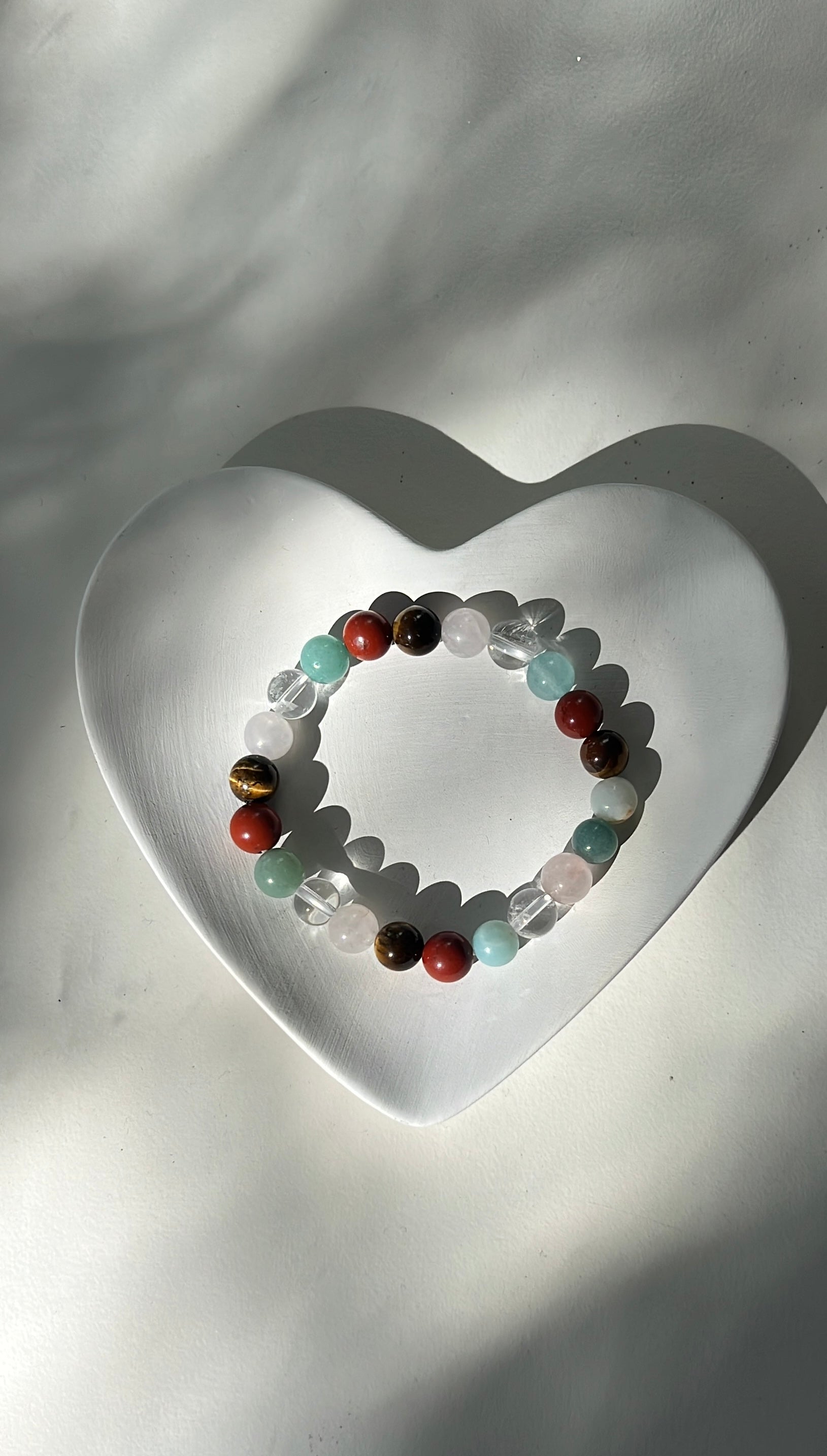 Red Jasper brings grounding energy, helping with focus, compassion, and tranquility, while reducing anxiety. Amazonite enhances self-expression and relationship harmony, soothing worries and promoting balance. Clear Quartz amplifies personal power and clarity, supporting balanced energy and spiritual growth. Tiger Eye strengthens confidence and focus, bringing courage, protection, and luck. Rose Quartz nurtures love and self-esteem, fostering harmony in relationships and healing emotional wounds.