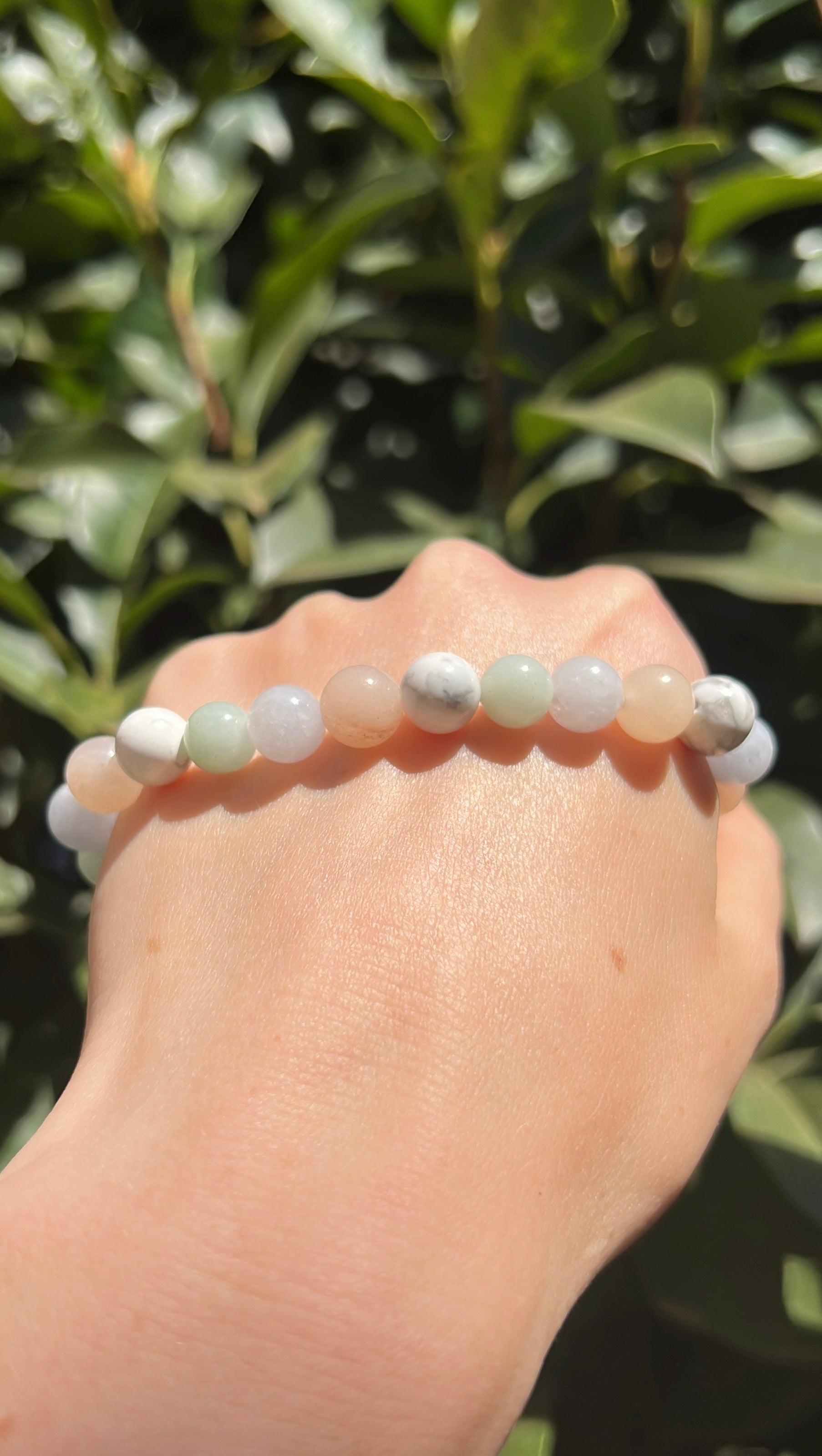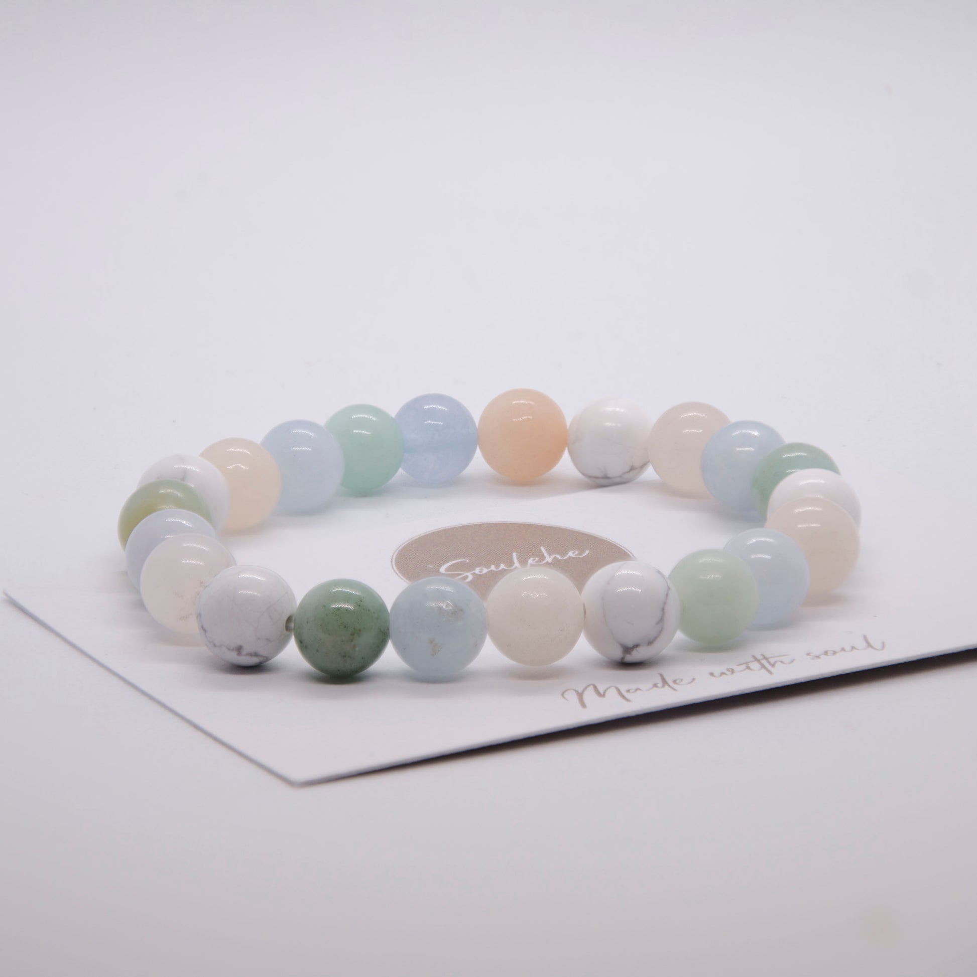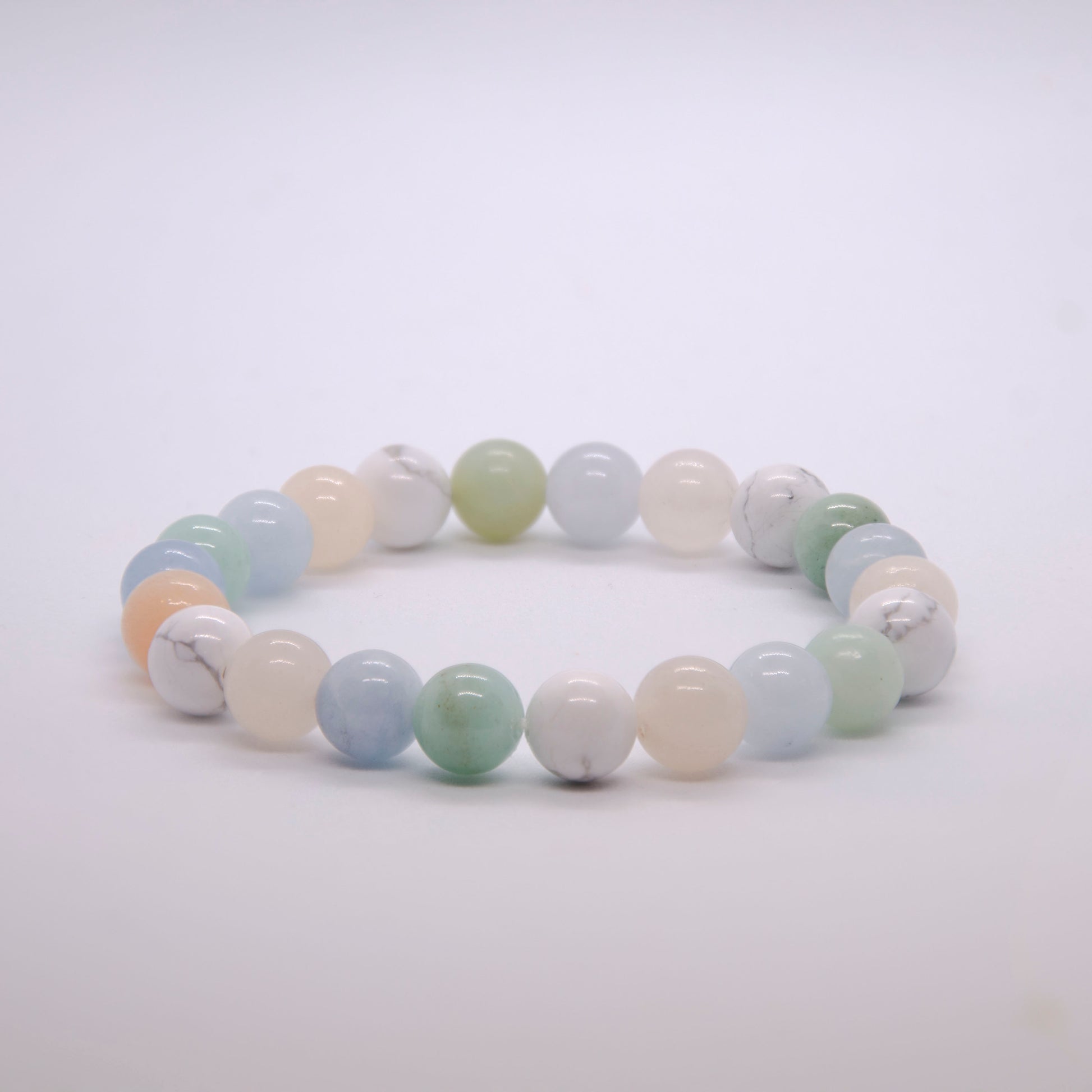 Howlite promotes peace, easing stress and anxiety, and encouraging restful sleep and self-love. Amazonite supports self-expression and balance, relieving worries and enhancing relationships. Pink Aventurine brings happiness and compassion, fostering creativity and positive energy, while soothing excessive emotions. Aquamarine adds courage and calm, supporting love, clarity in relationships, and spiritual growth.