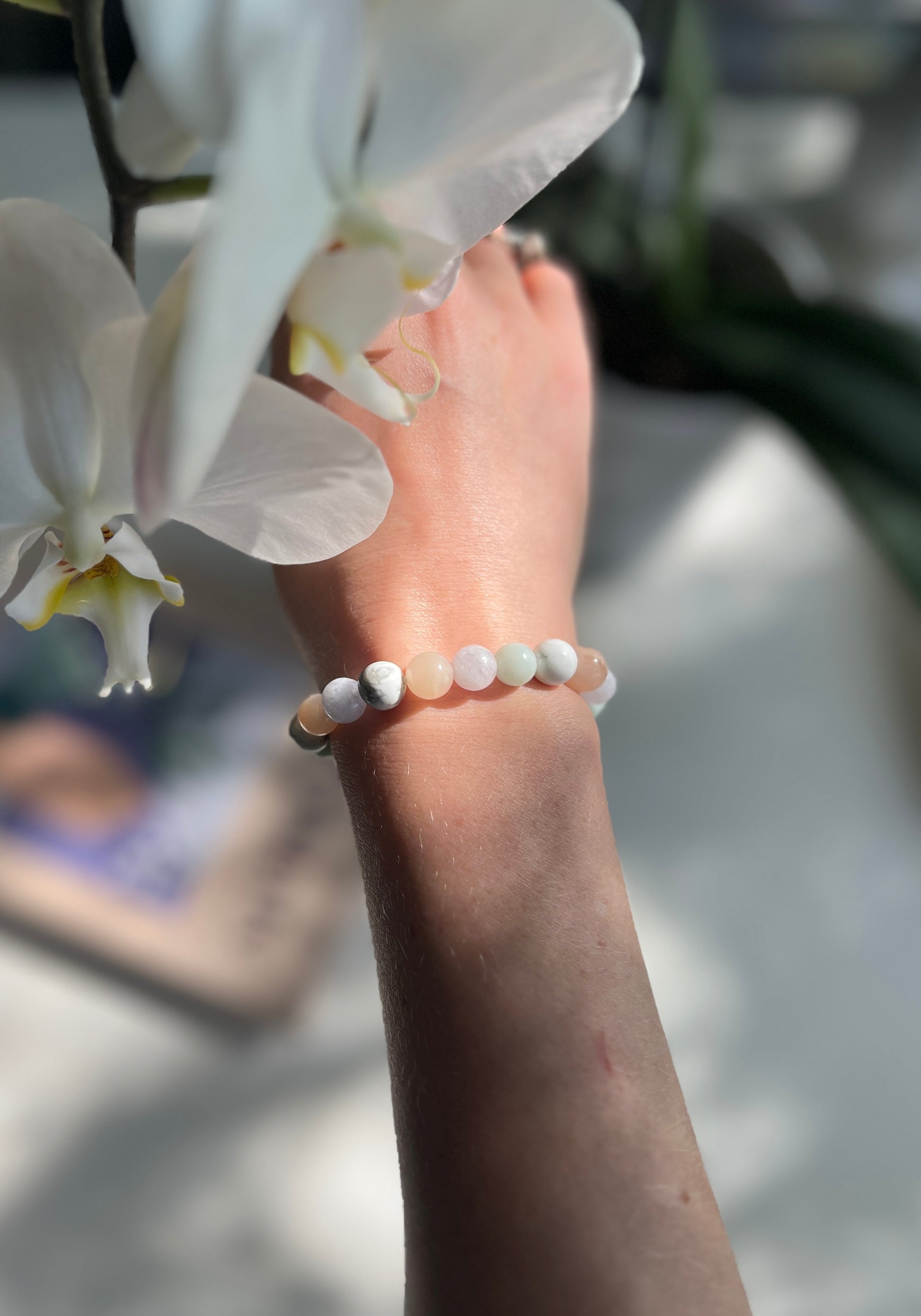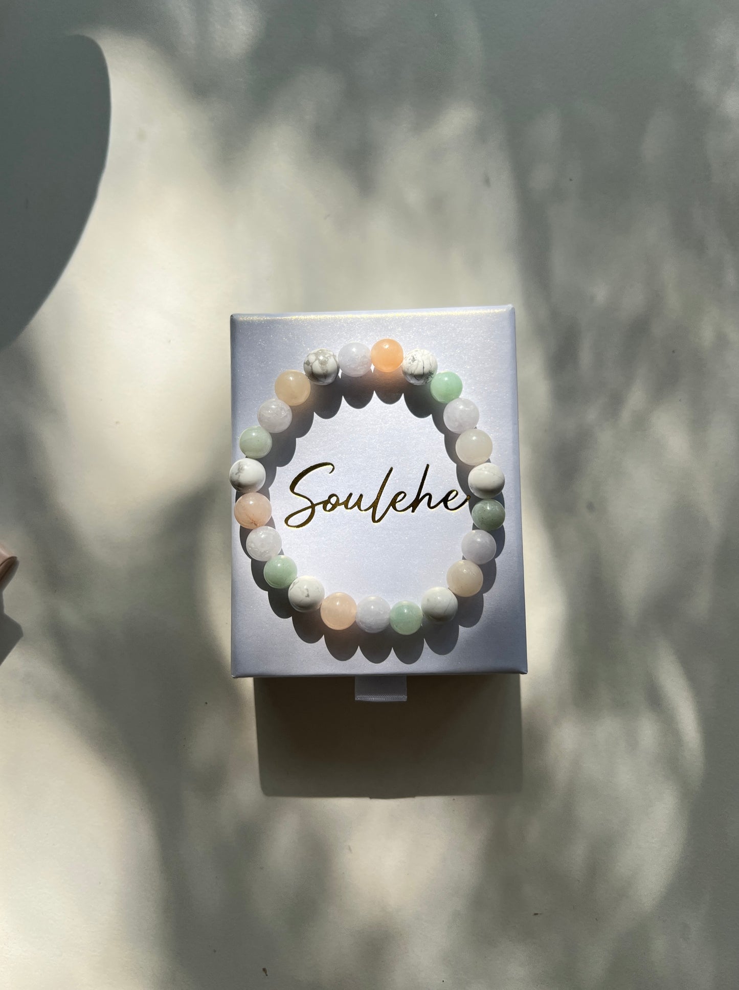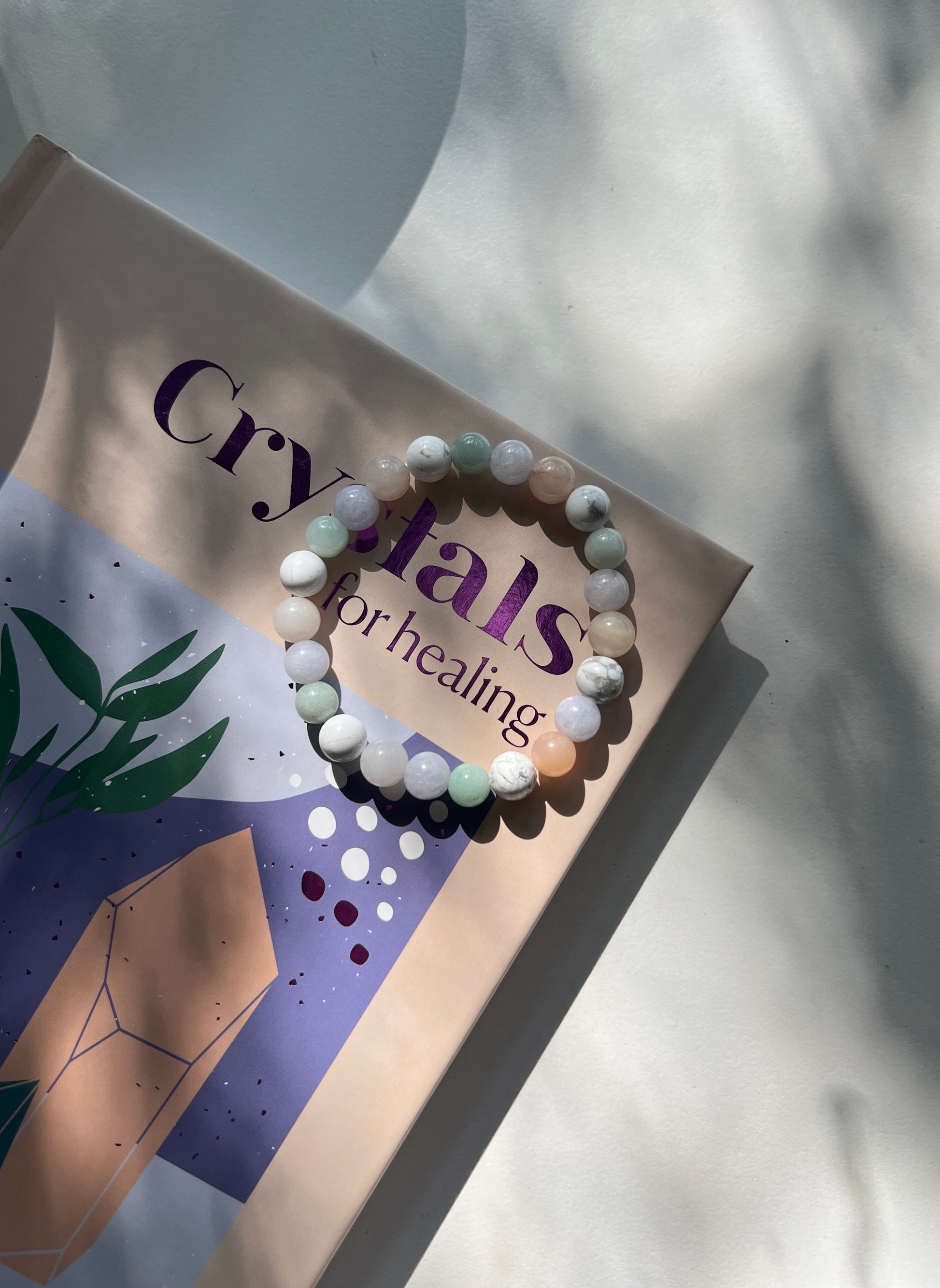 Howlite promotes peace, easing stress and anxiety, and encouraging restful sleep and self-love. Amazonite supports self-expression and balance, relieving worries and enhancing relationships. Pink Aventurine brings happiness and compassion, fostering creativity and positive energy, while soothing excessive emotions. Aquamarine adds courage and calm, supporting love, clarity in relationships, and spiritual growth.