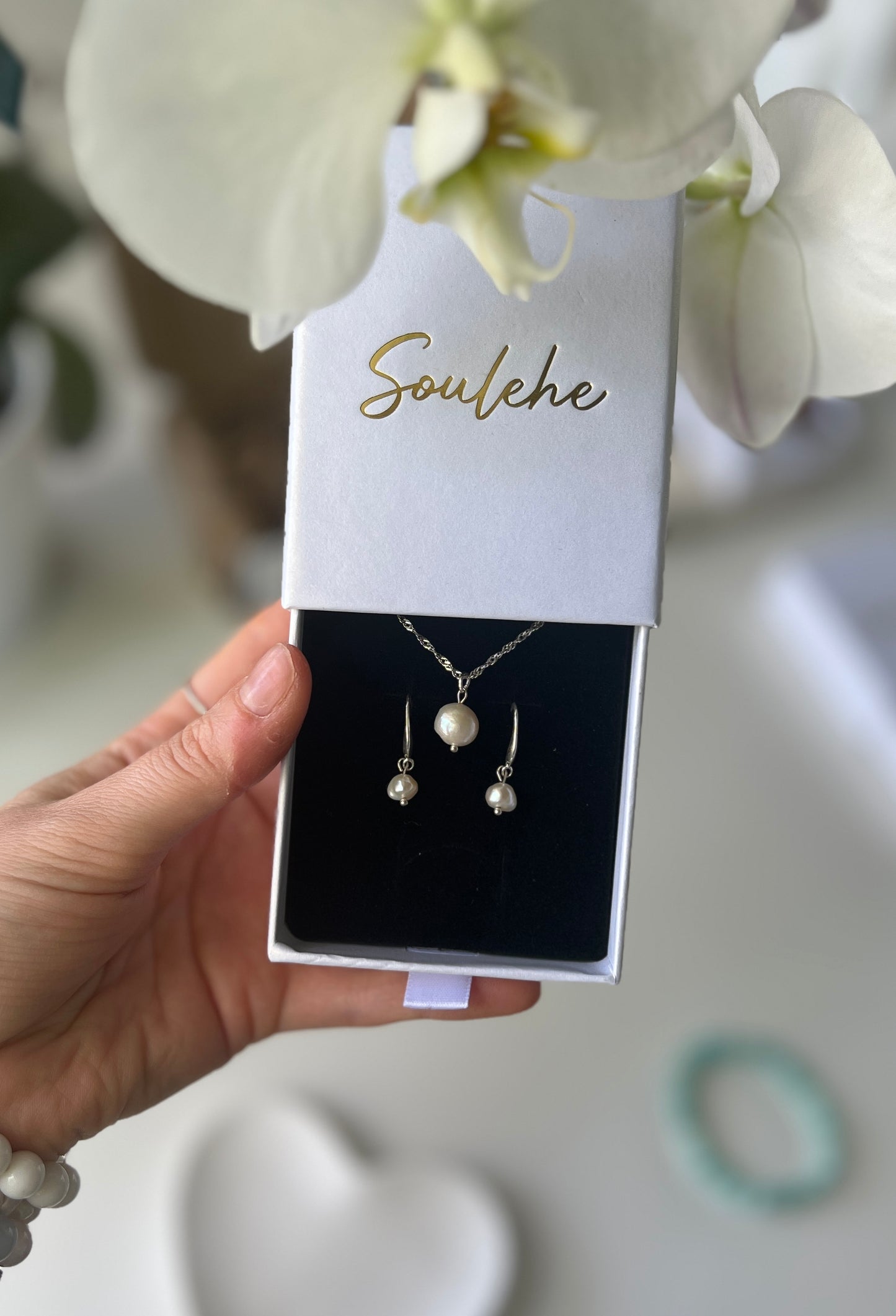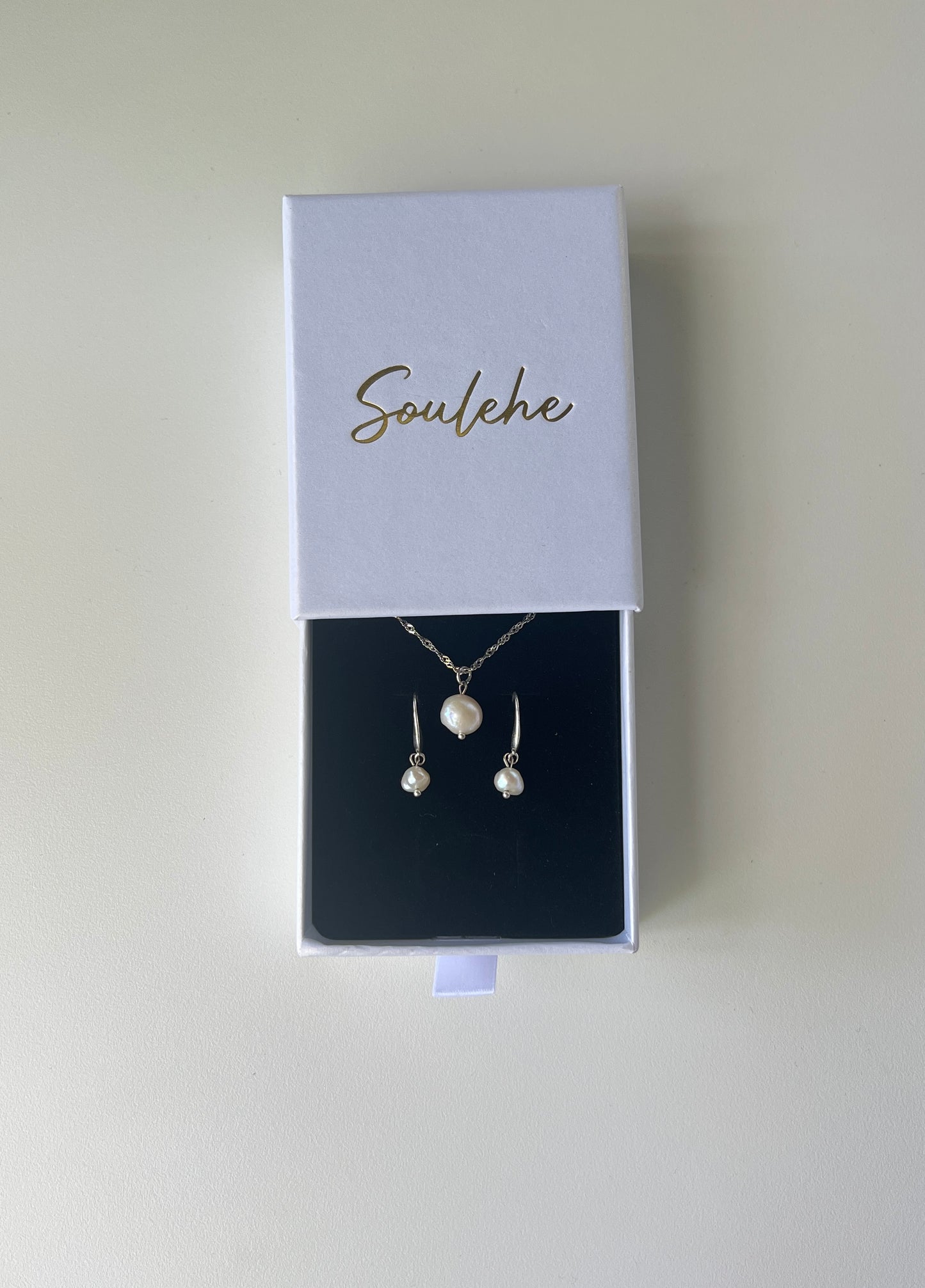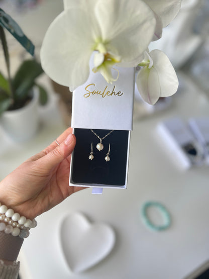 This stunning necklace and earring curated set features the timeless elegance of pearls, embodying femininity and grace.