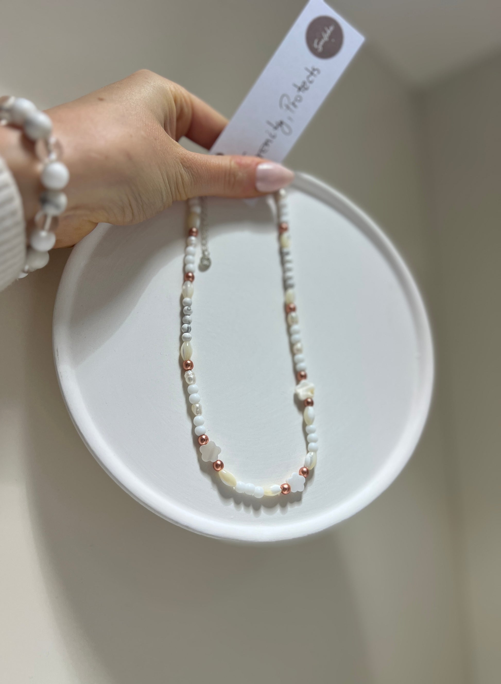 This elegant choker necklace combines the beauty of Shell, White Agate, Pearl, and Hematite, creating a harmonious blend of intuition, balance, and grounding.